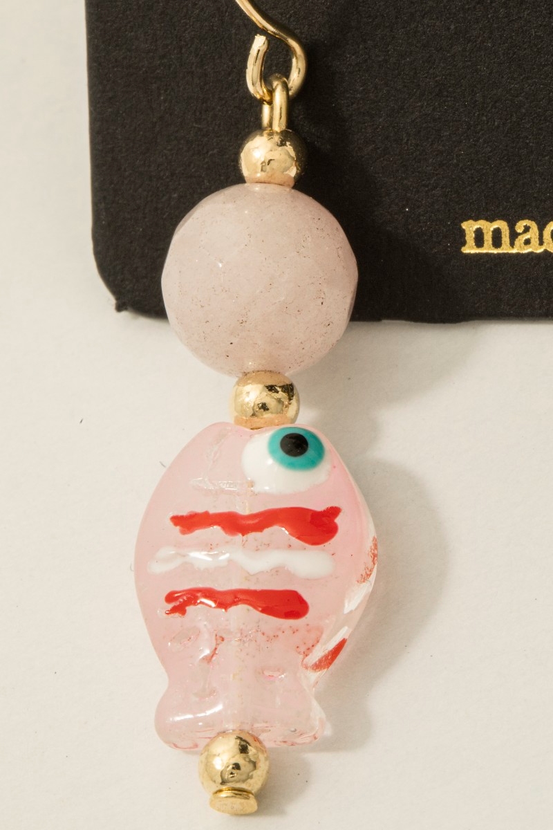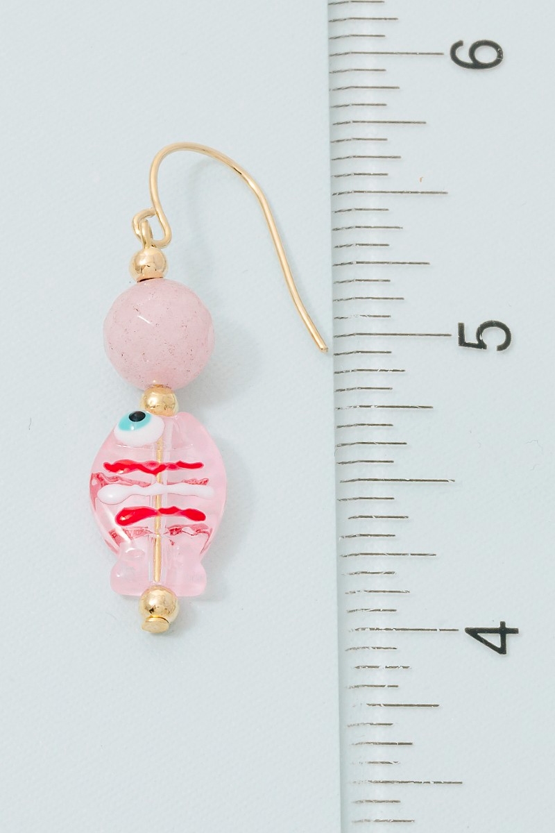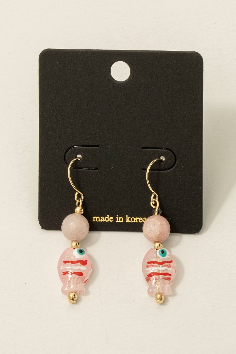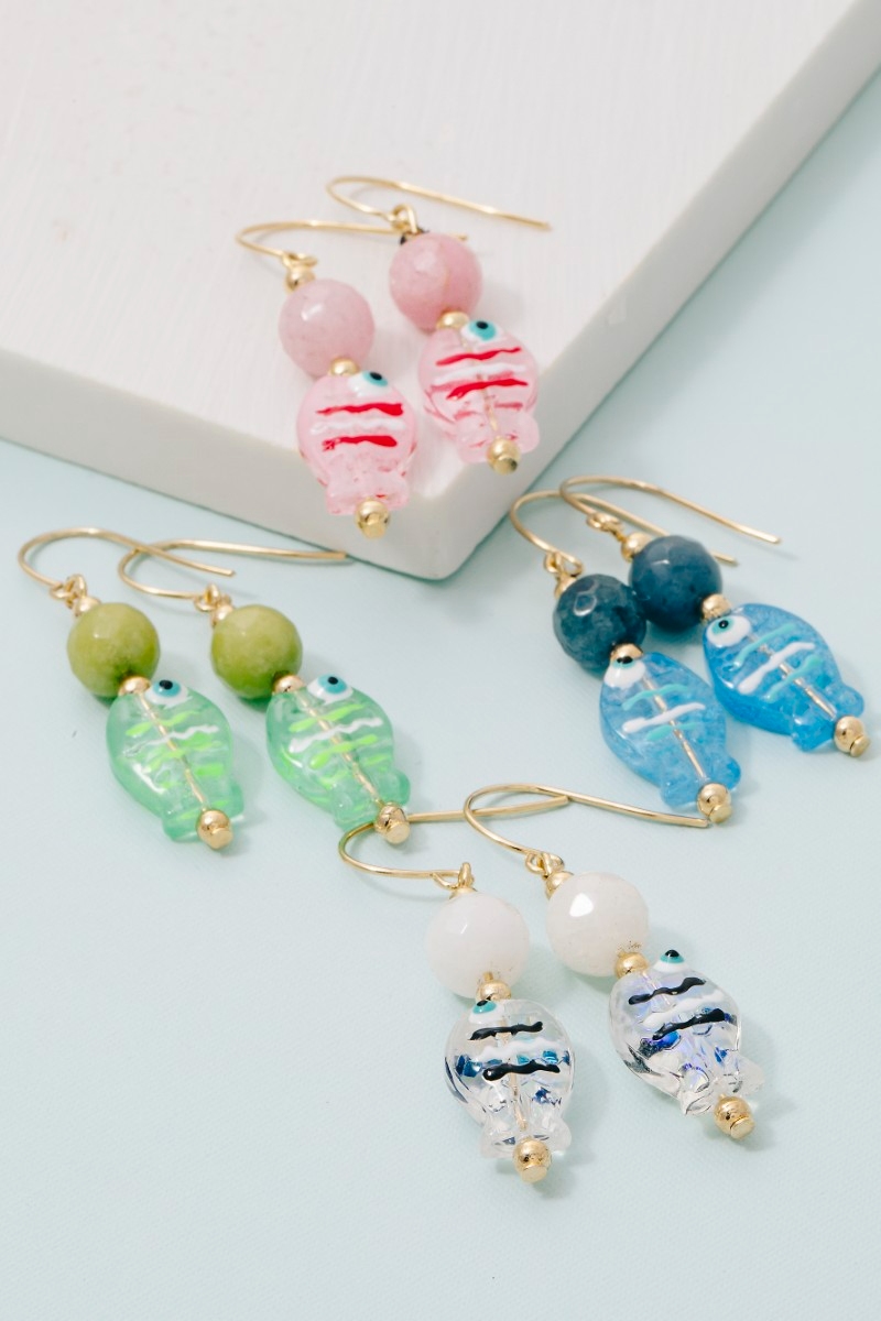 • This pair of drop earrings features a fashionable gemstone glass bead fish style. Experience the joy of accessorizing with this piece that effortlessly combines versatility and charm.
