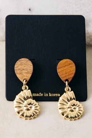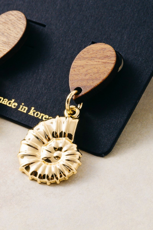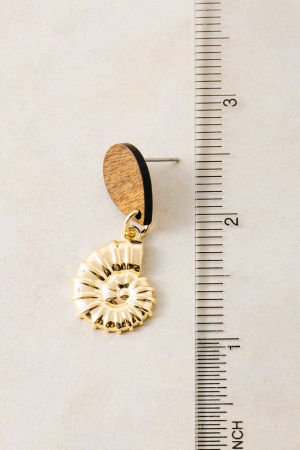 - This pair of dangle earrings displays a fashionable metallic spiral sea shell and wooden tear stud style. Explore a refined sense of style with this pair of dangle earrings, seamlessly elevating the chic factor of your look.