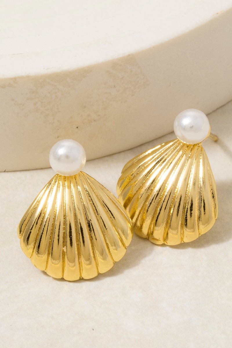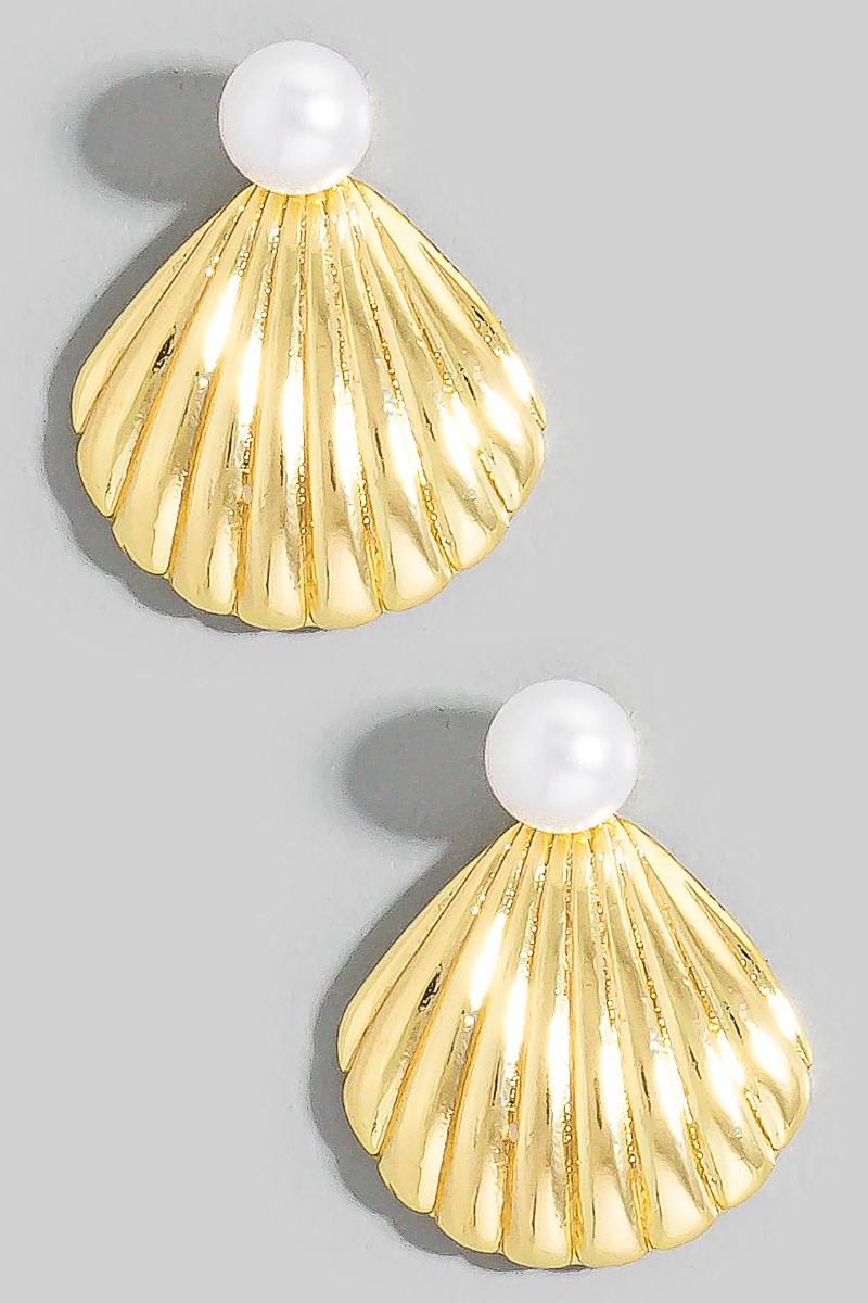 • This pair of dangle earrings brings a unique pearl and clam shell stud style. Indulge in the artistry of accessorizing with this unique piece.