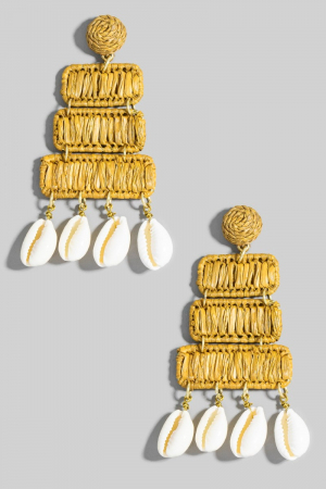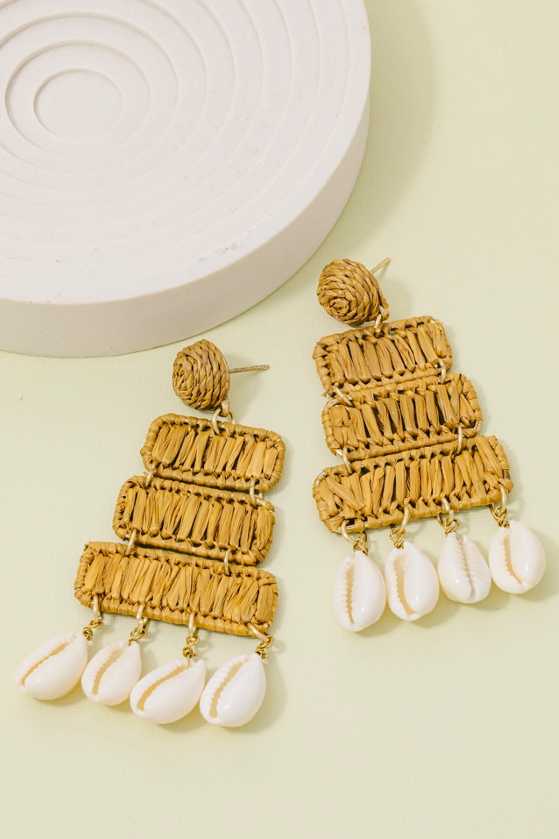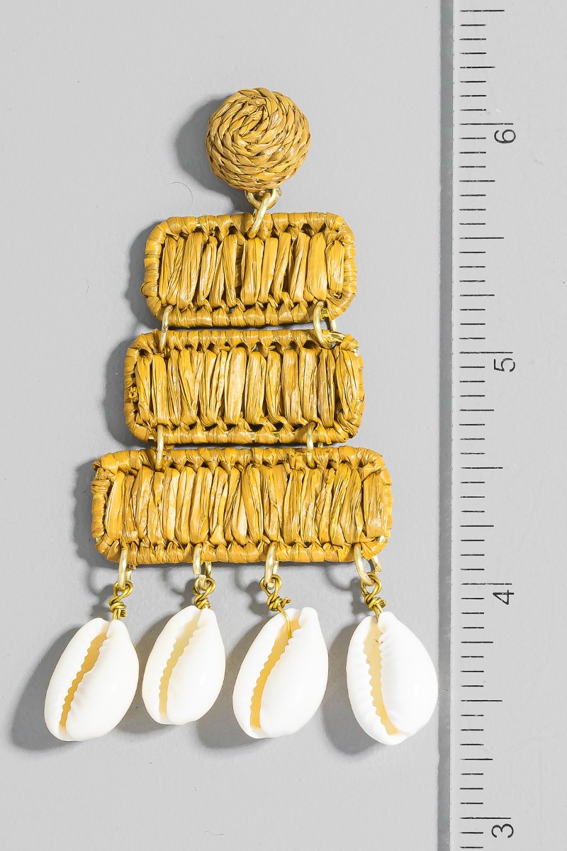 • This pair of dangle earrings displays a vibrant raffia rectangles and puka shells style. Redefine your look effortlessly with this standout, on-trend piece.