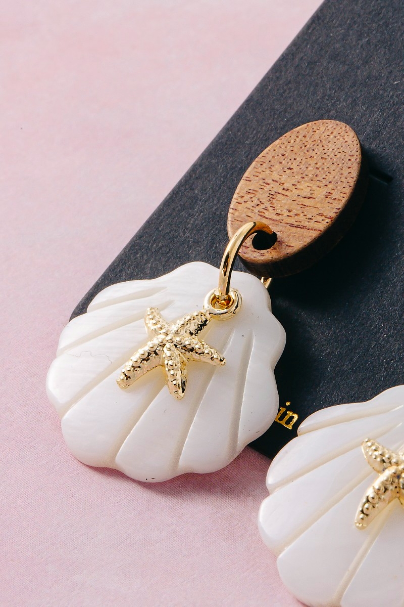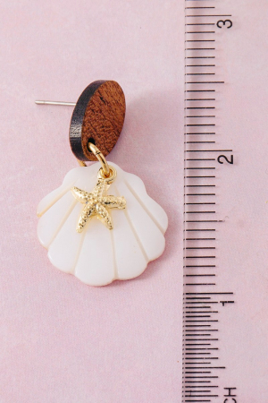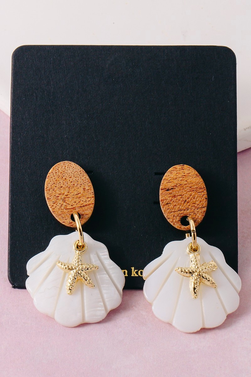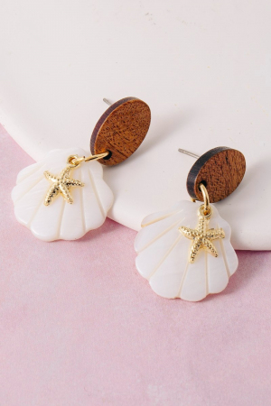 - This pair of dangle earrings displays a fashionable sea shell starfish and wooden oval stud style. Explore a blend of classic charm and contemporary flair.