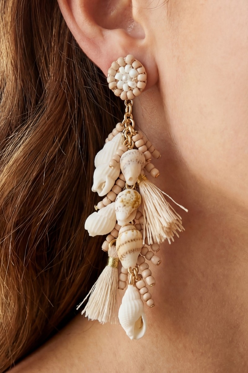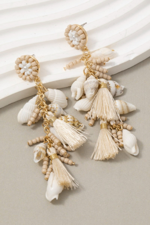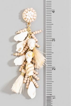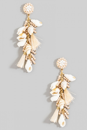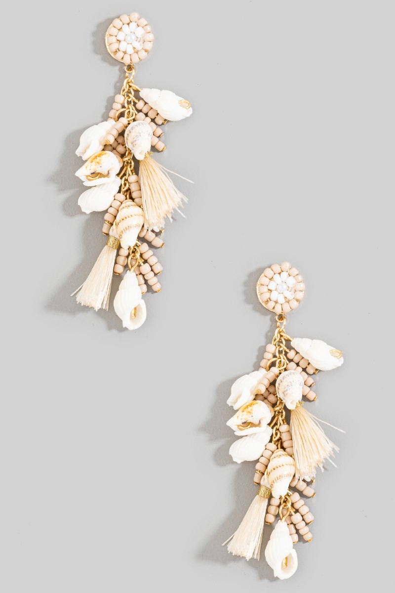 - This pair of dangle earrings adds a modern tiered sea shells beads tassels stud style. Elevate your ensemble with this chic, timeless pair of dangle earrings.