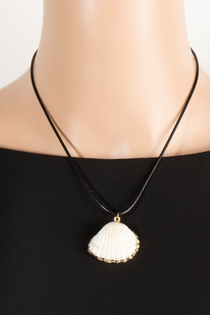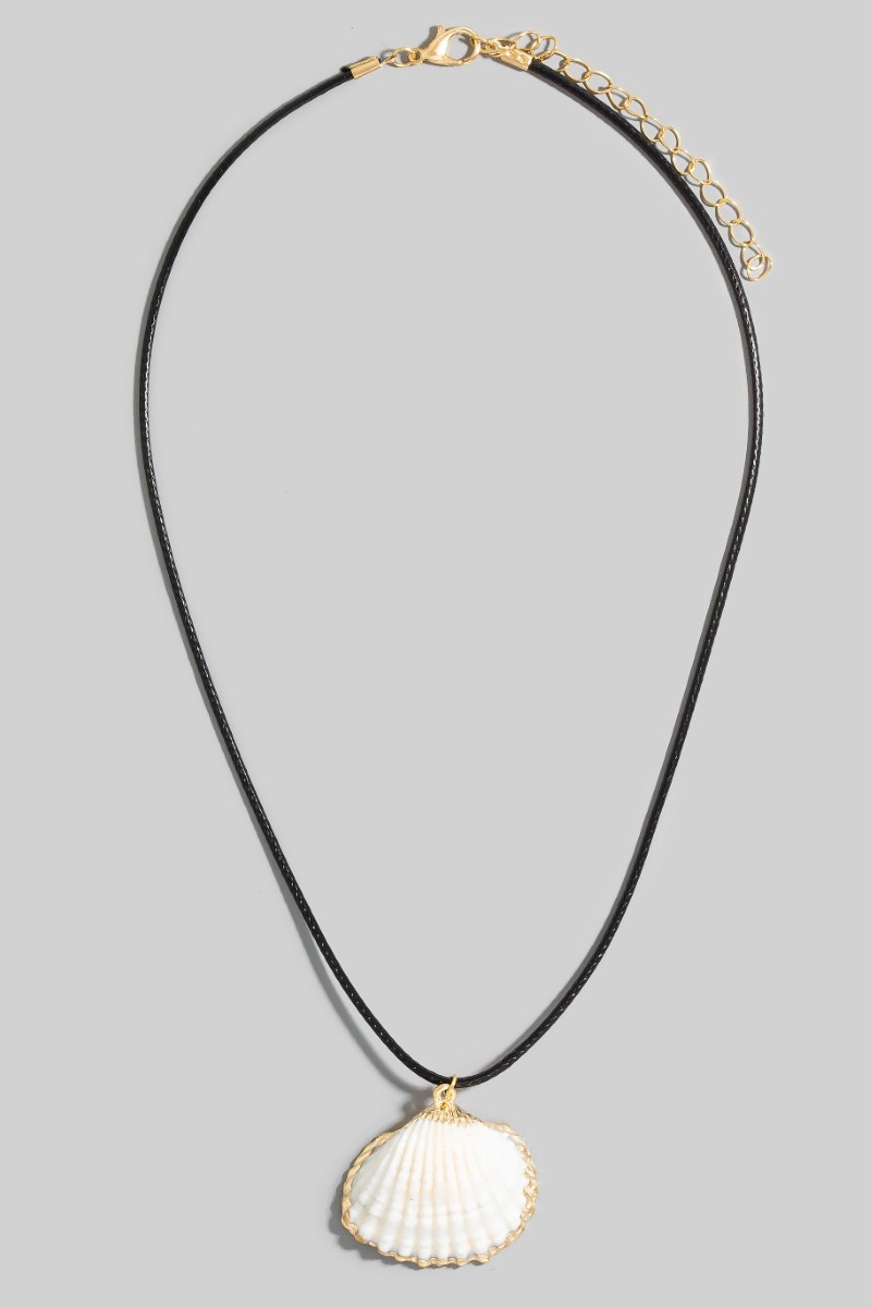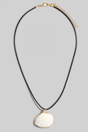 - This necklace brings a unique metallic accent clam shell pendant cord style. Immerse yourself in the details of design, as this necklace effortlessly becomes a conversation starter.