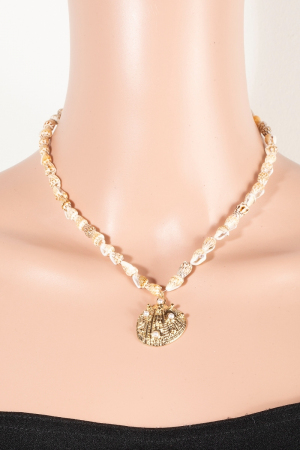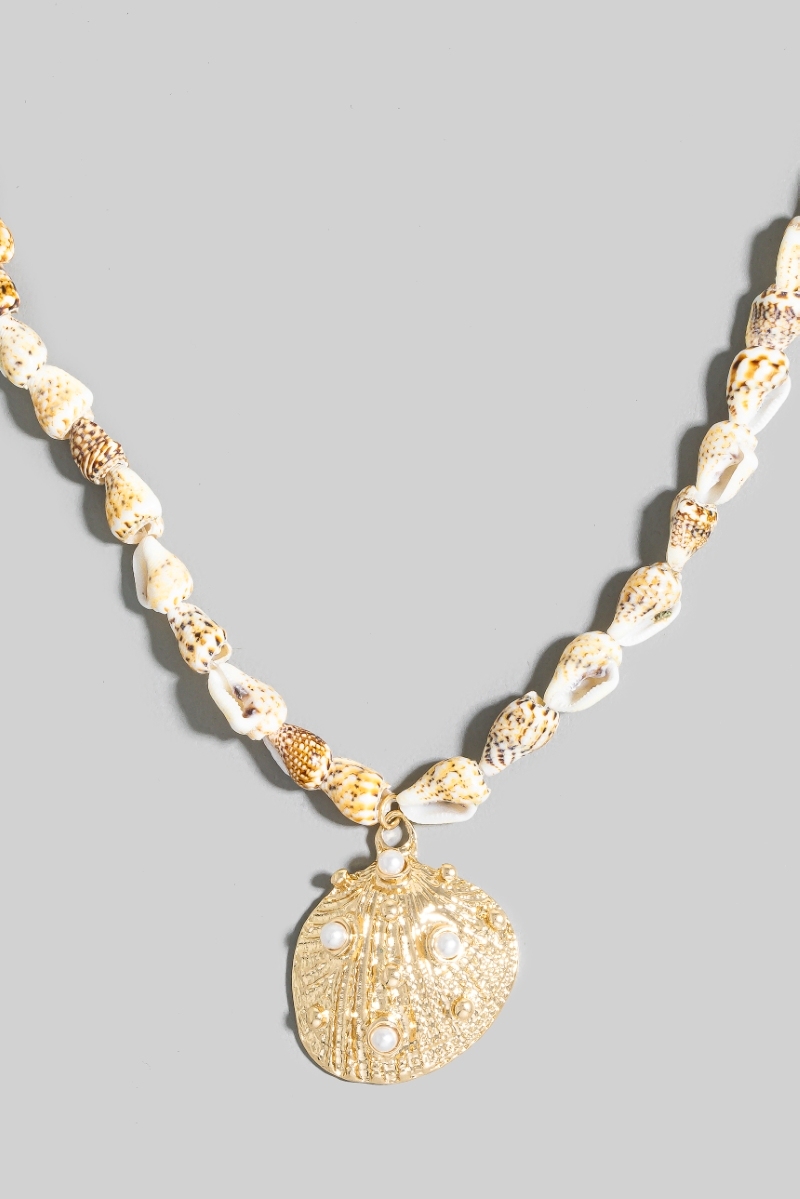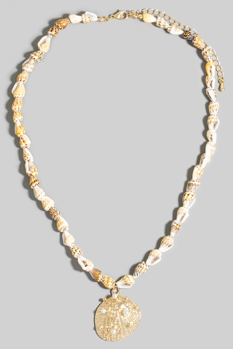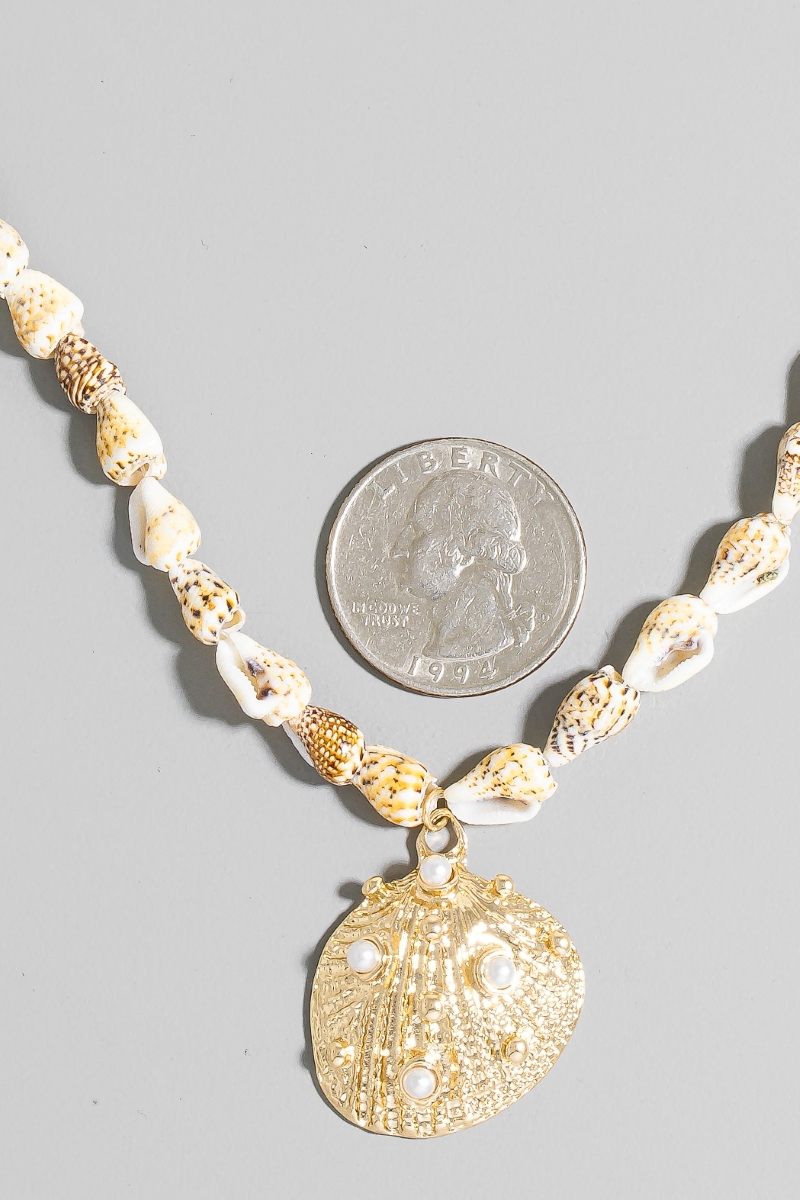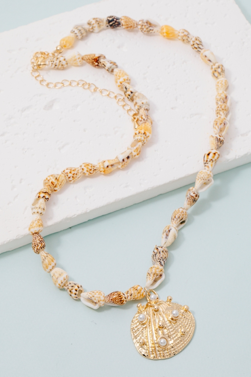 - This necklace introduces a unique pearl studded clam shell pendant conch beaded style. Embark on a journey of sartorial refinement as this necklace effortlessly complements your fashion sense.
