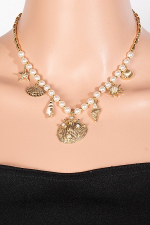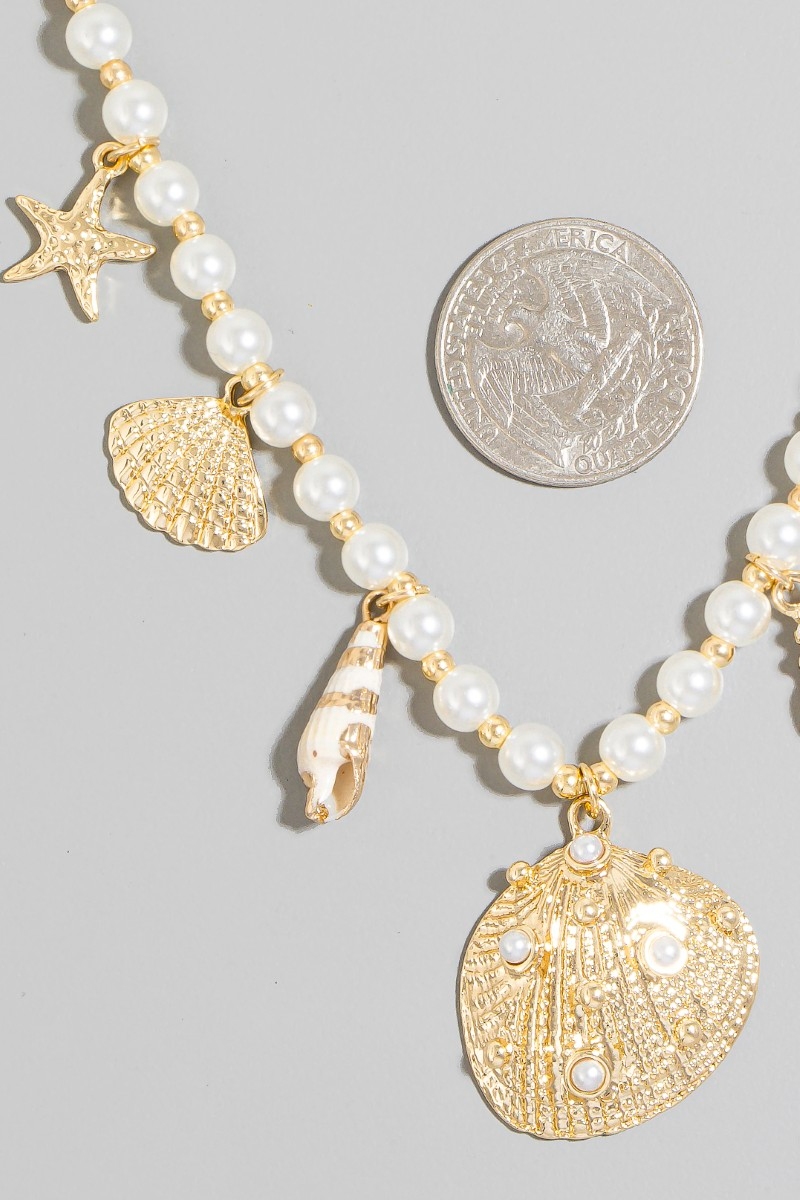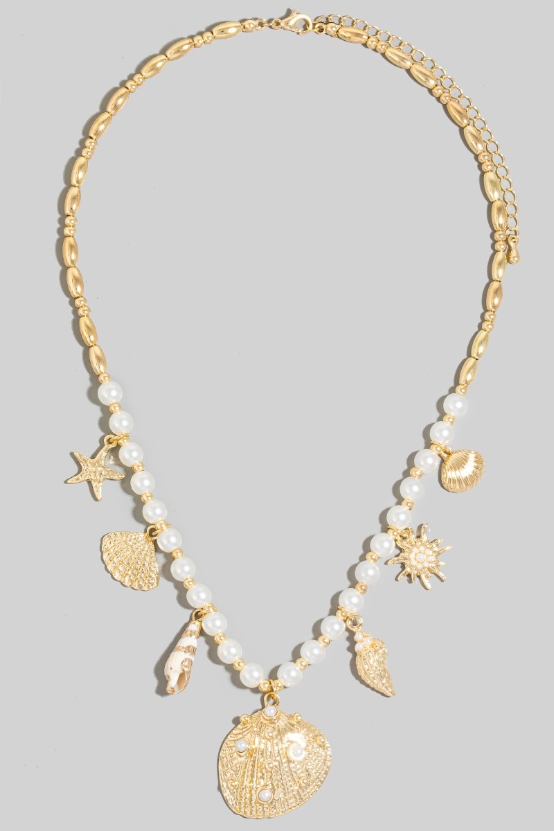 - This chain necklace introduces a stunning sea shell charms pearl beaded style. Revel in the intricate design that effortlessly distinguishes this chain necklace, making it a statement piece.