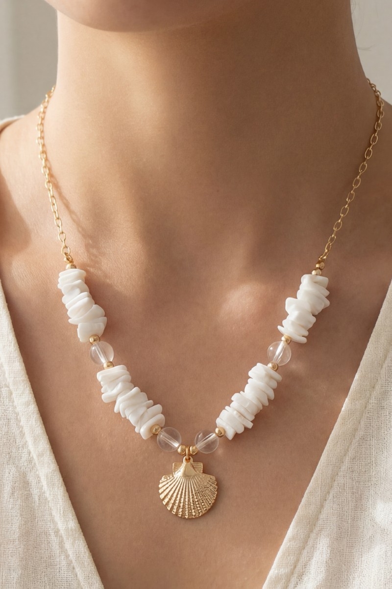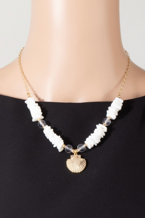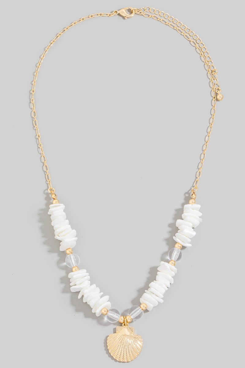 • This pendant necklace introduces a stunning sea shell pendant chip shell beaded necklace style. Delight in the nuanced details that make this pendant necklace a testament to fine design and impeccable taste.