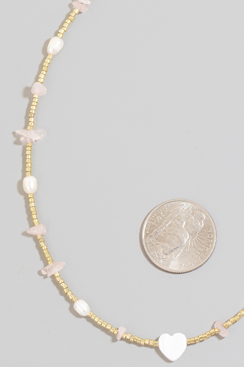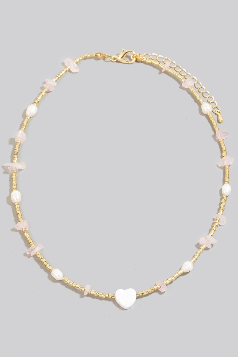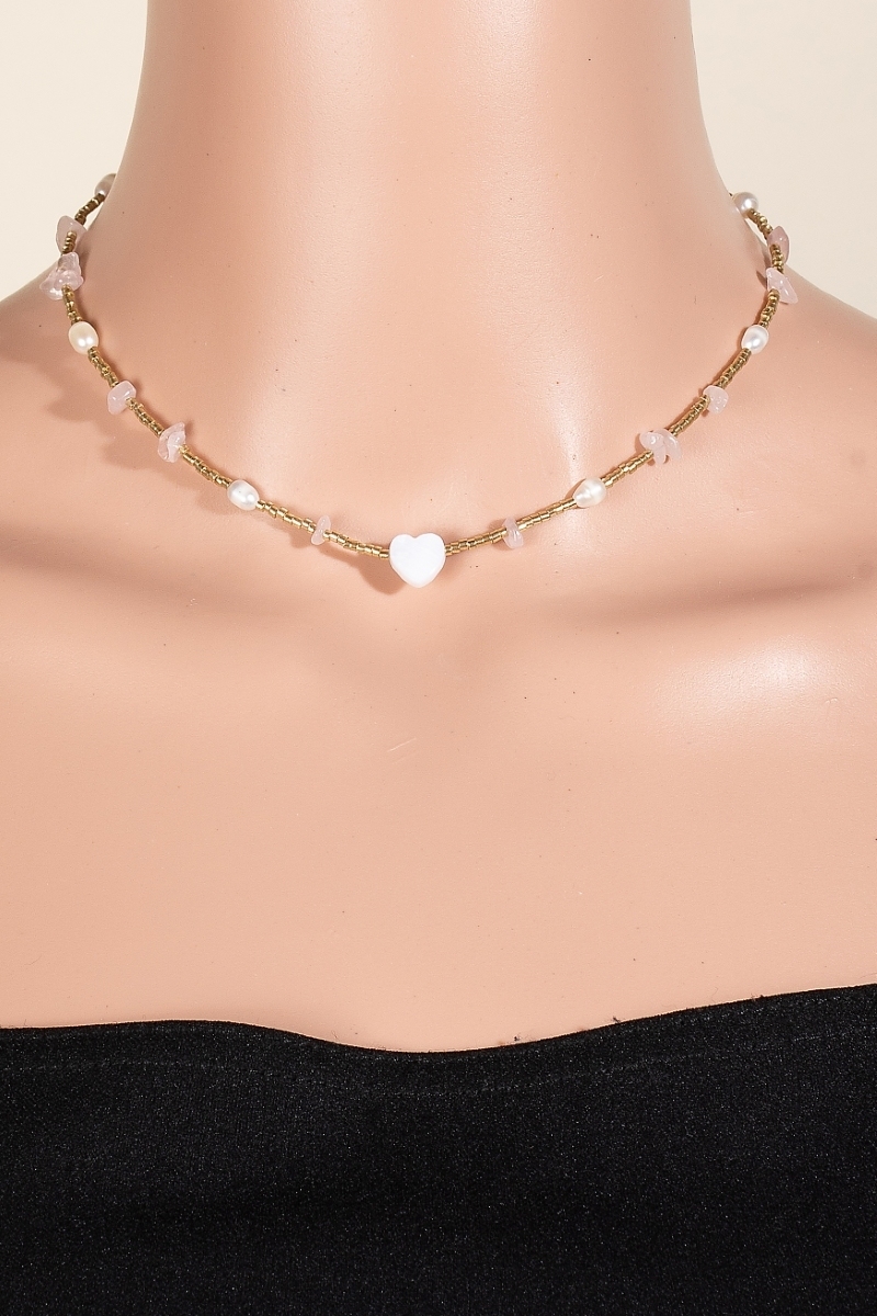 - This necklace displays a vibrant shell heart pendant pearl and pebble stone beaded style. Discover the perfect balance of subtlety and flair as this necklace effortlessly completes your look.