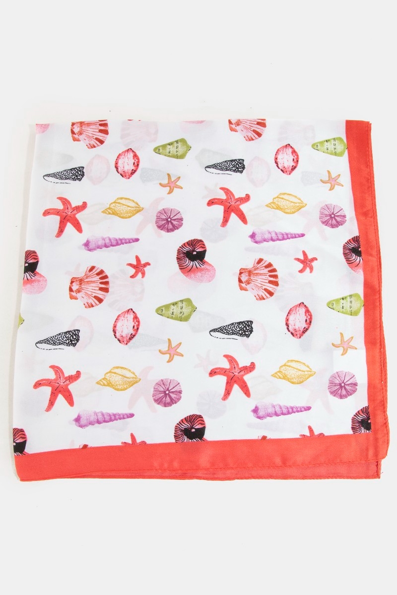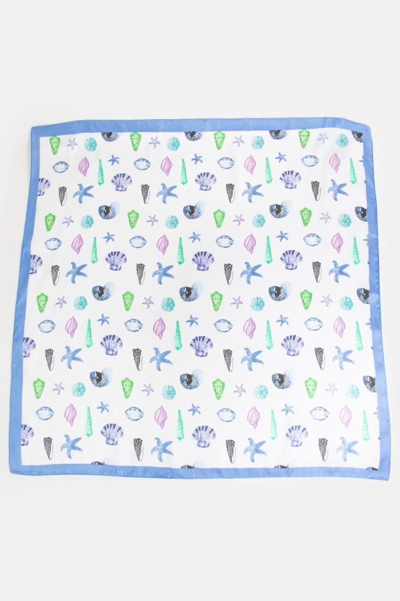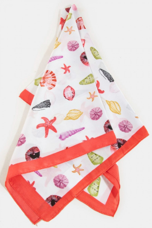 • This scarf displays a fashionable sealife multi seashells bandana style. Experience refined sophistication with this understated yet stylish piece.