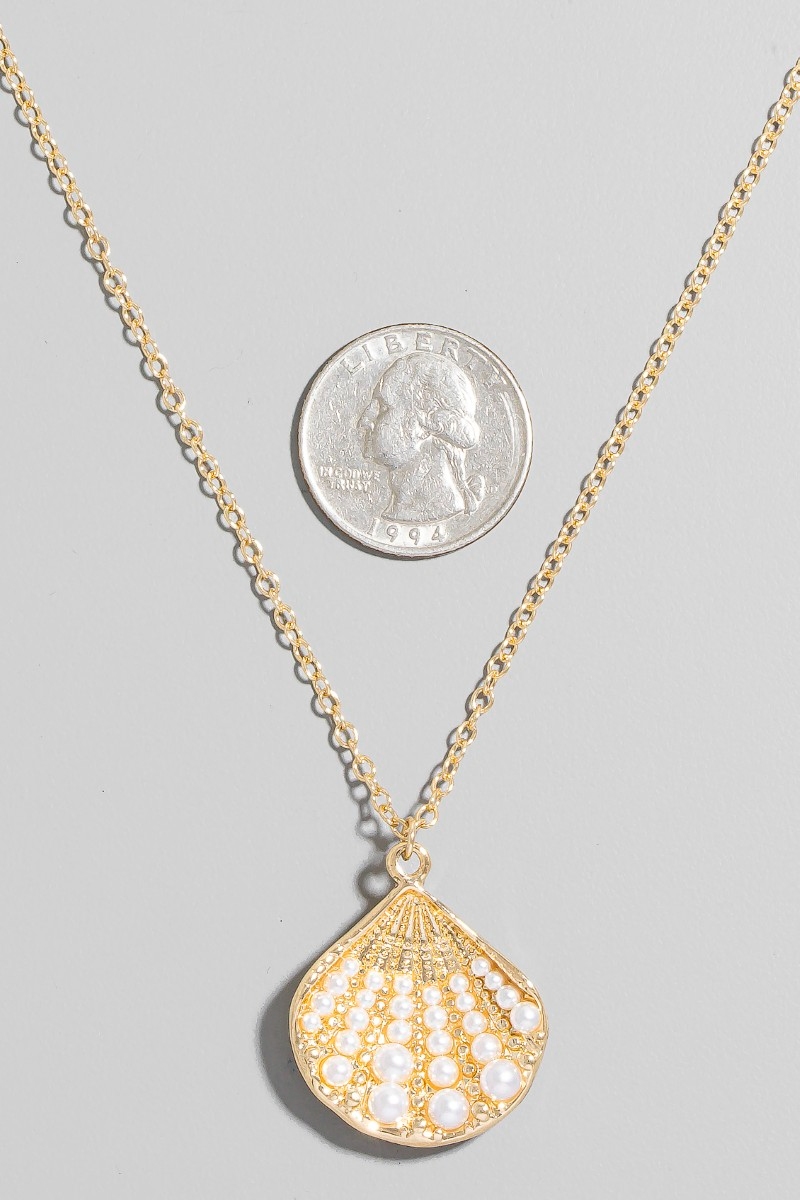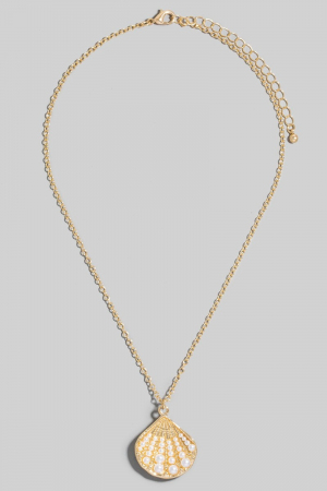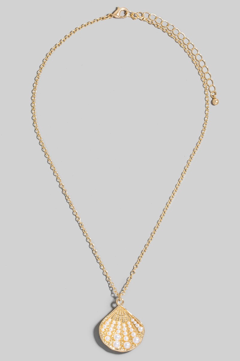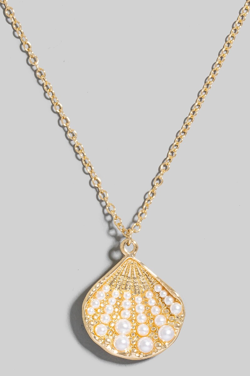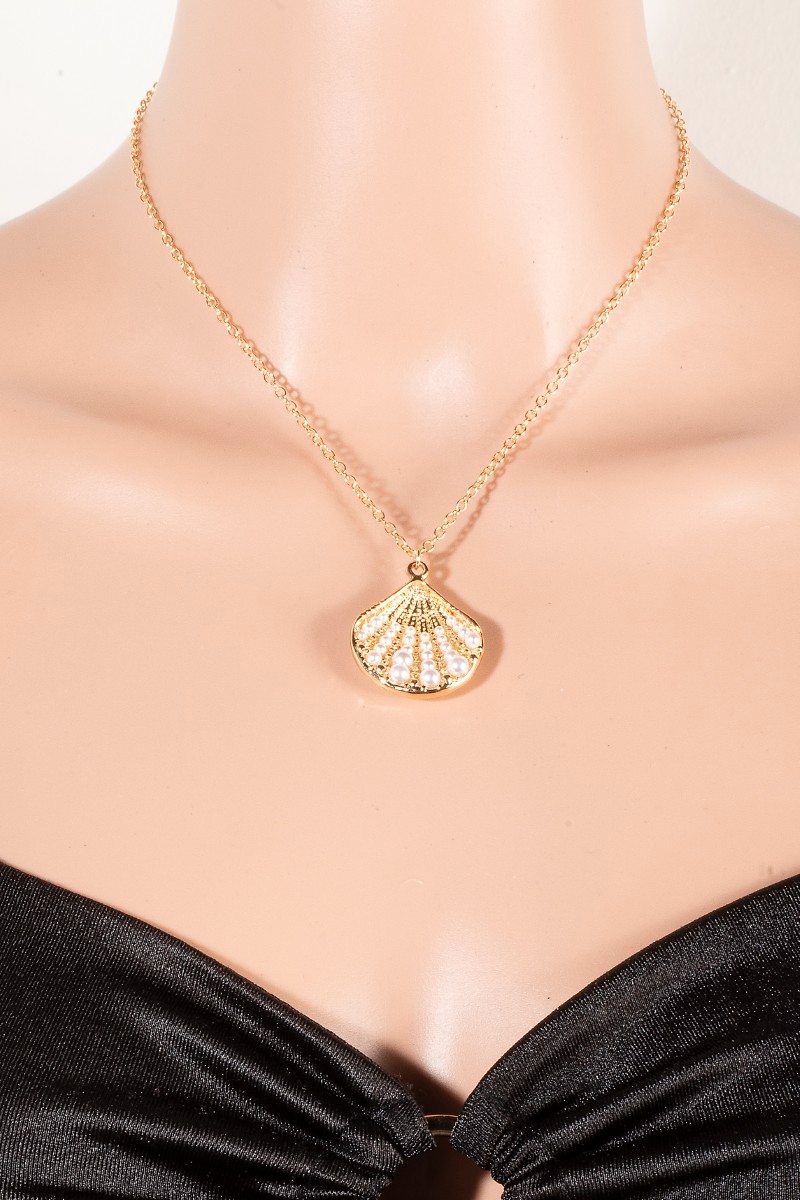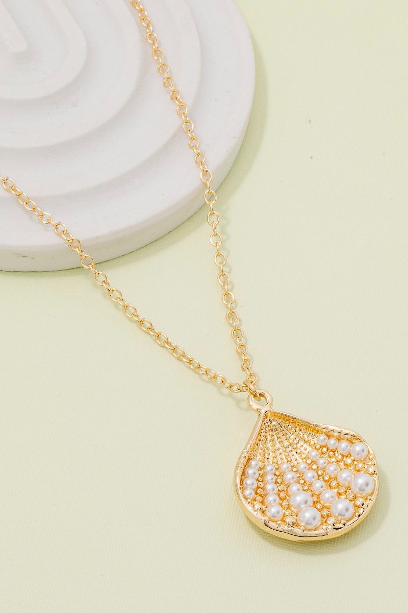 - This necklace introduces a unique pearl studded clam shell pendant style. Immerse yourself in the world of understated glamour as this necklace effortlessly exudes timeless appeal.