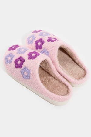 - This pair of slippers features a fashionable fuzzy purple floral slippers style. Discover the perfect balance of functionality and fashion.