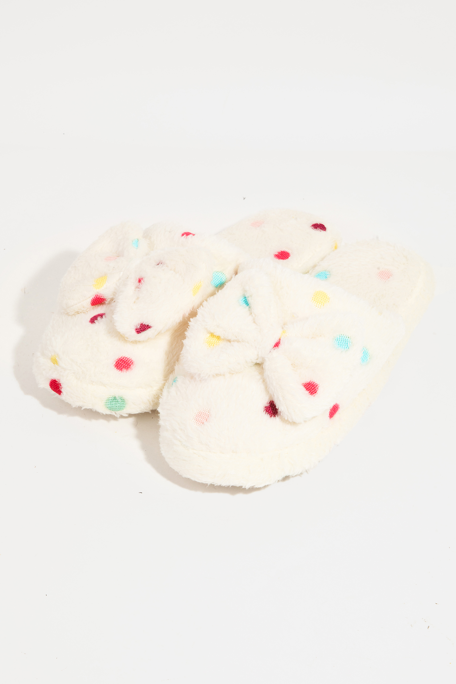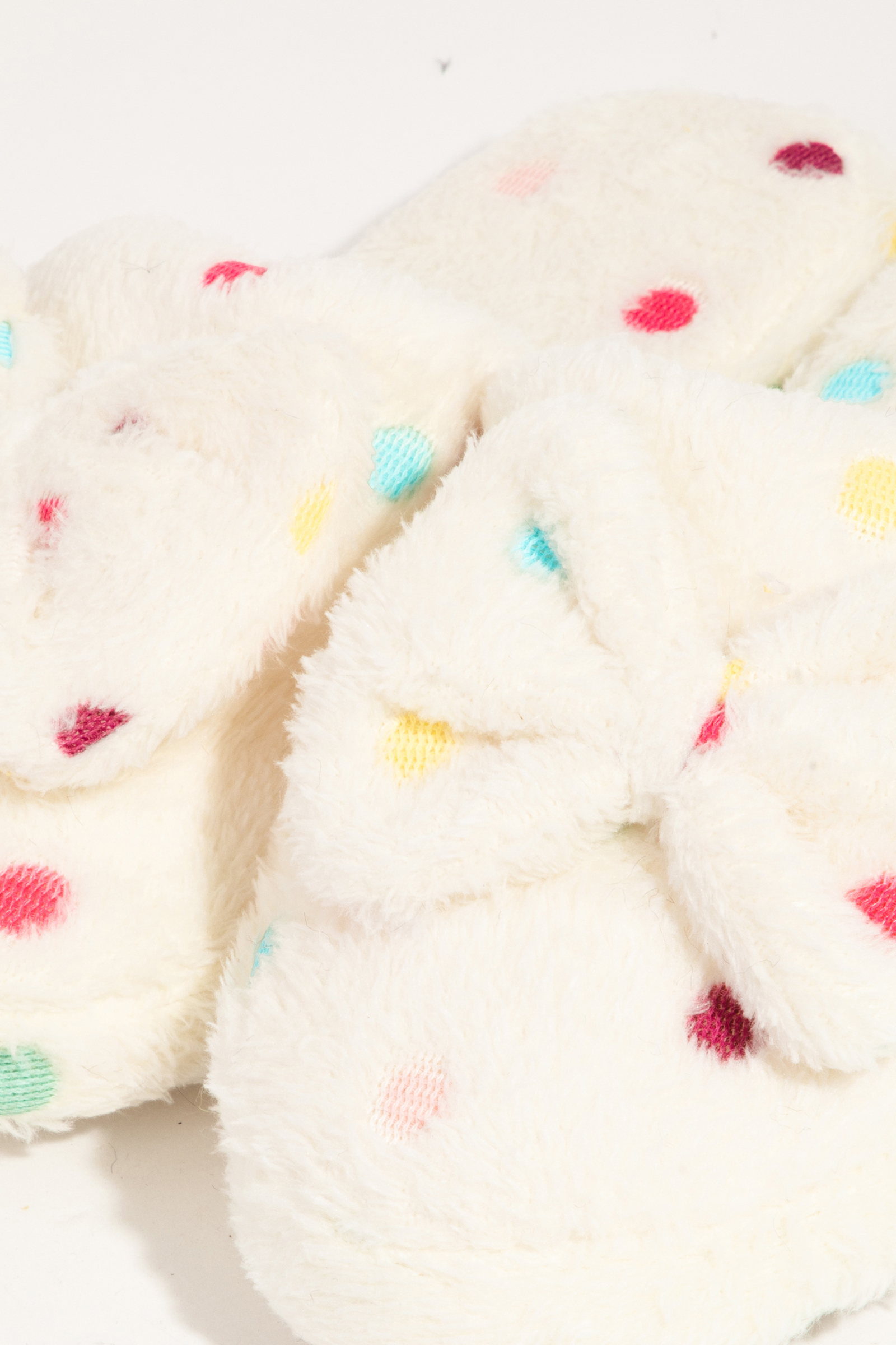 • This pair of slippers showcases a unique polka dot bowtie fuzzy slippers style. Unveil modern elegance with this subtly intricate pair of slippers.