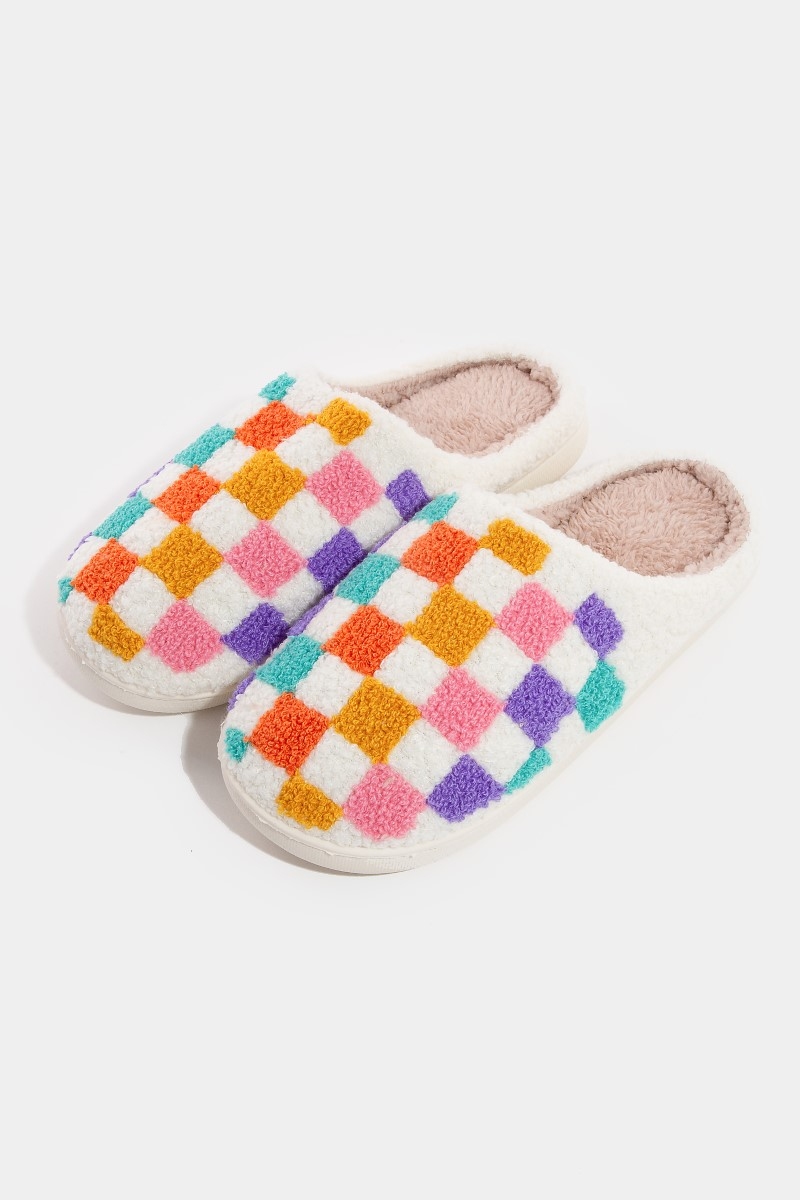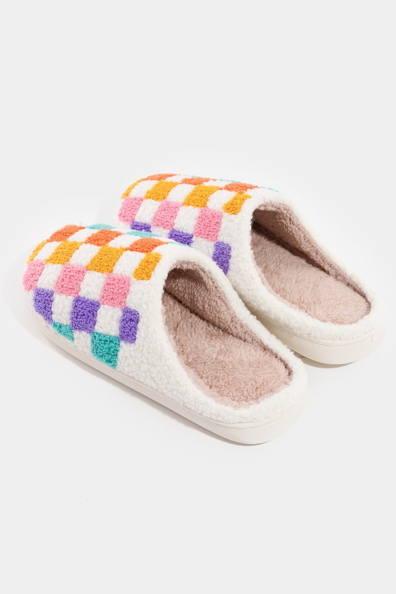 - This pair of slippers brings a luxurious vibrant colorful checkered fuzzy slippers style. Delight in the intricate details that make this pair of slippers an essential element in expressing your fashion identity.