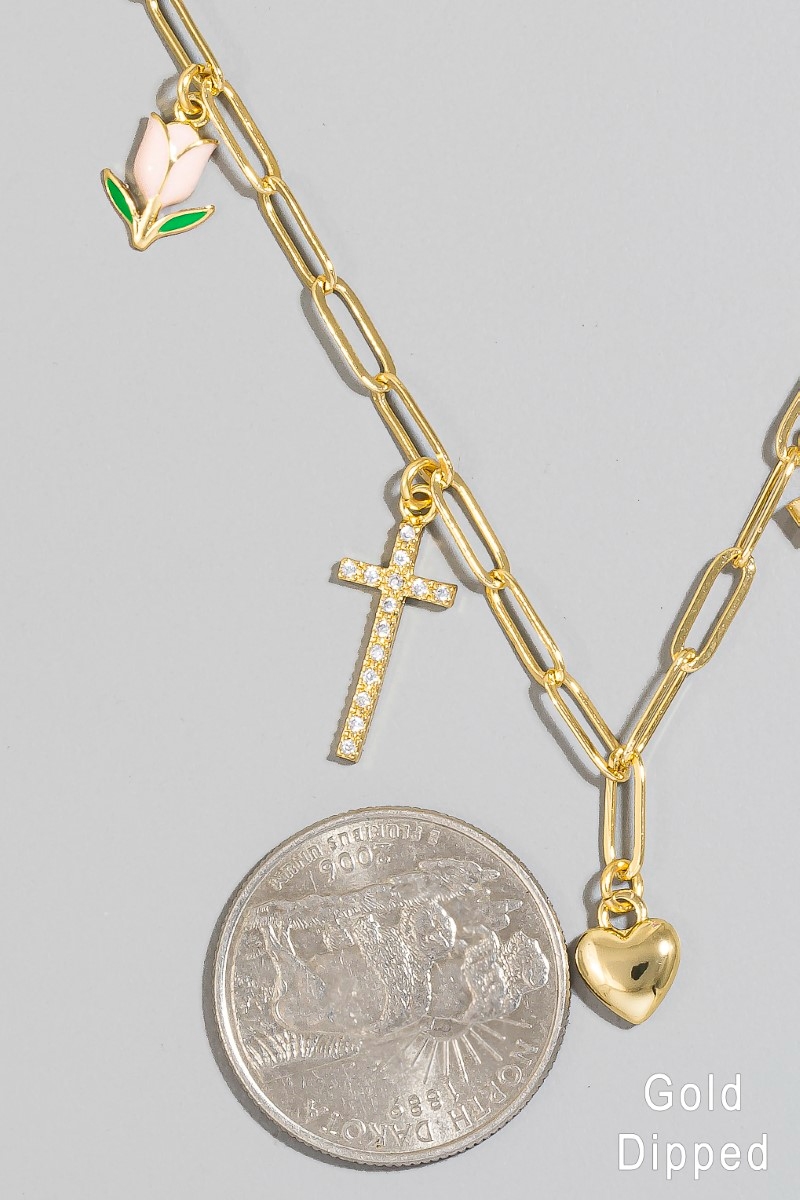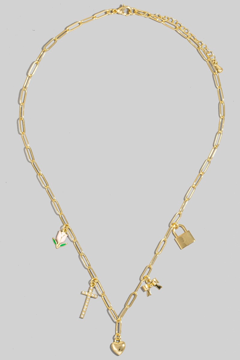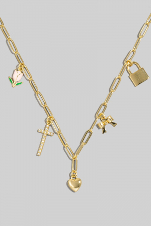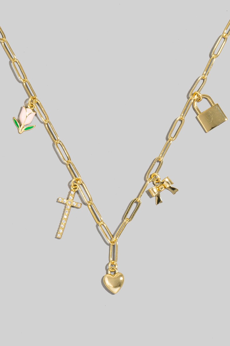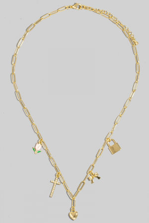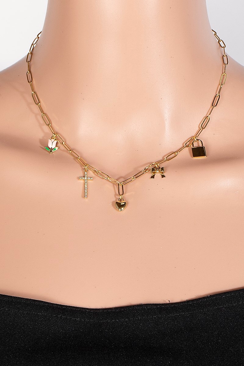 - This necklace brings a luxurious chain link flower cross heart bow lock charm style. Savor the craftsmanship that goes beyond the ordinary, as this necklace effortlessly captivates attention.
