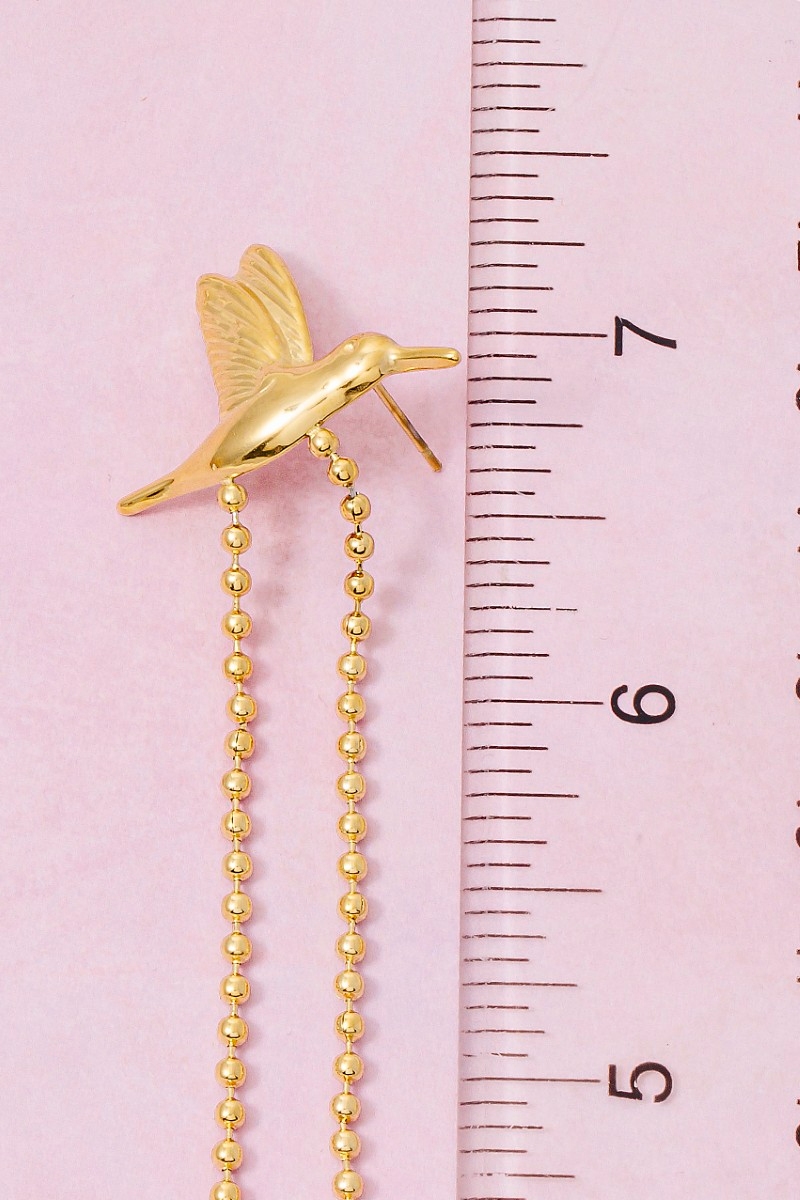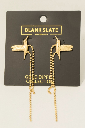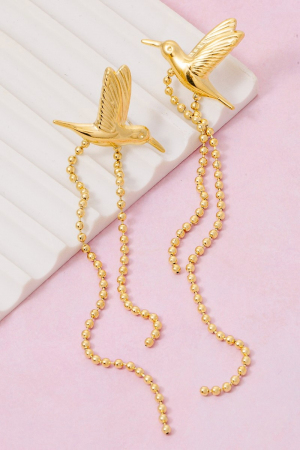 - This pair of dangle earrings introduces a stunning gold dipped humming bird and chain stud style. Indulge in the allure of exquisite craftsmanship as this pair of dangle earrings effortlessly adds a touch of luxury to your attire.