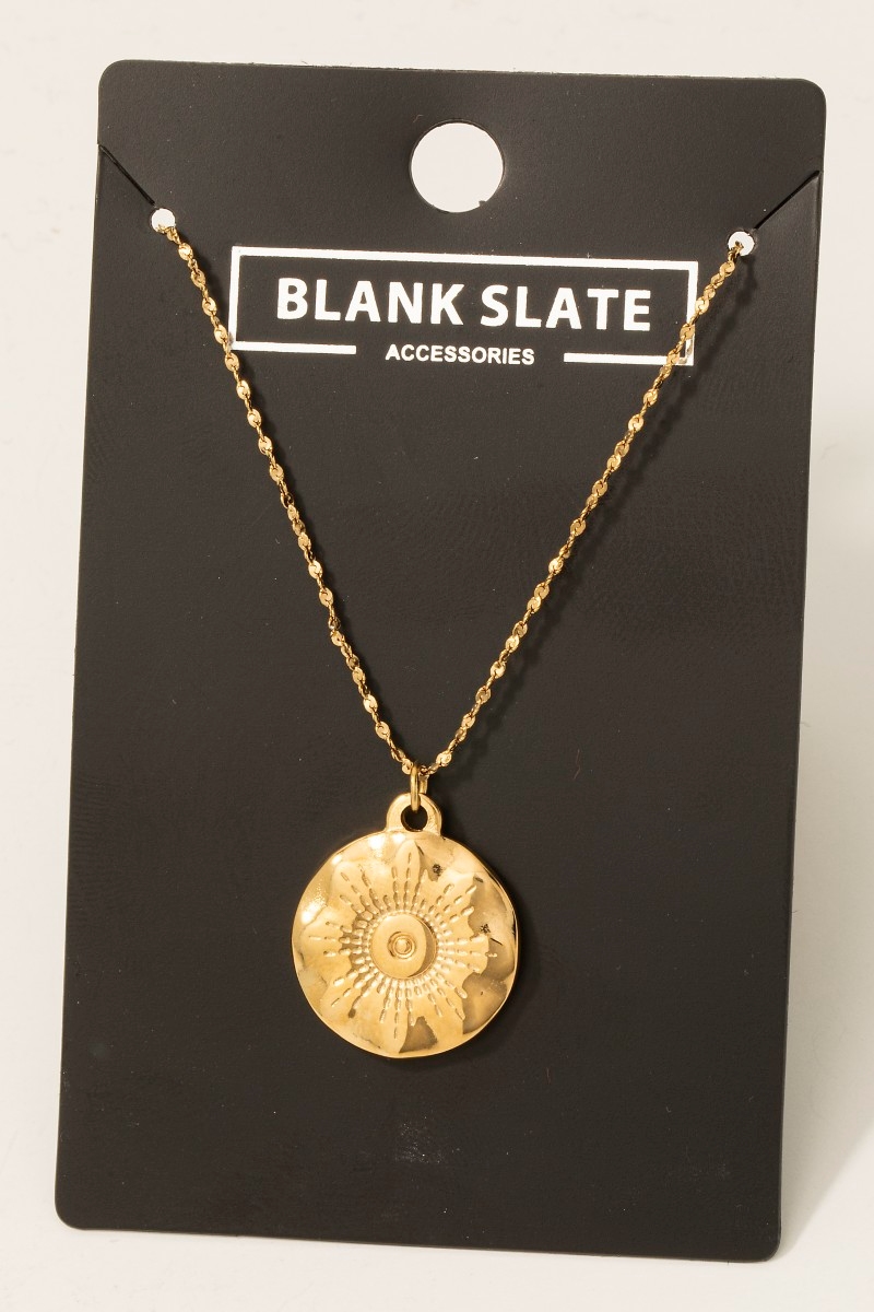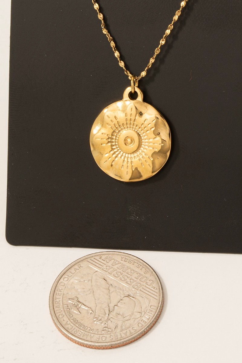 - This necklace displays a fashionable stainless steel flower etched coin pendant style. Celebrate individual style with this versatile, eye-catching addition.