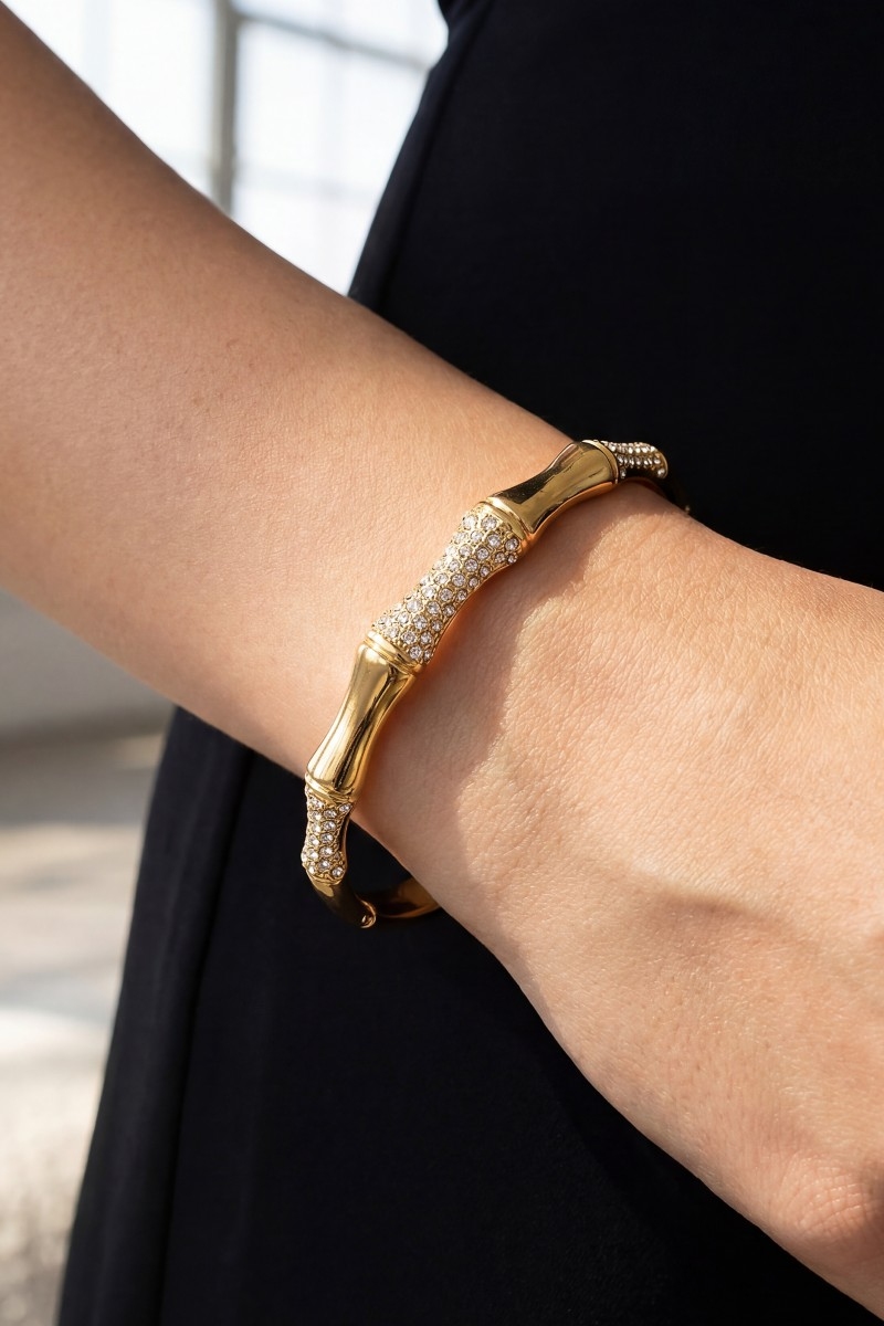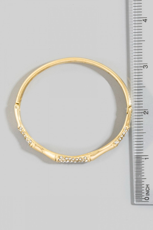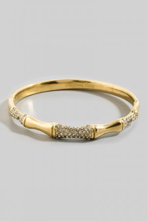 • This bangle bracelet displays a fashionable stainless steel pave bamboo style hinge style. Delight in the nuanced details that make this bangle bracelet a testament to fine design and impeccable taste.