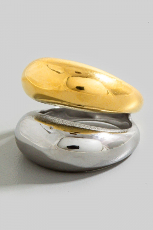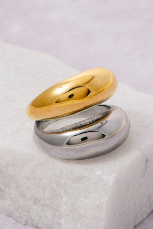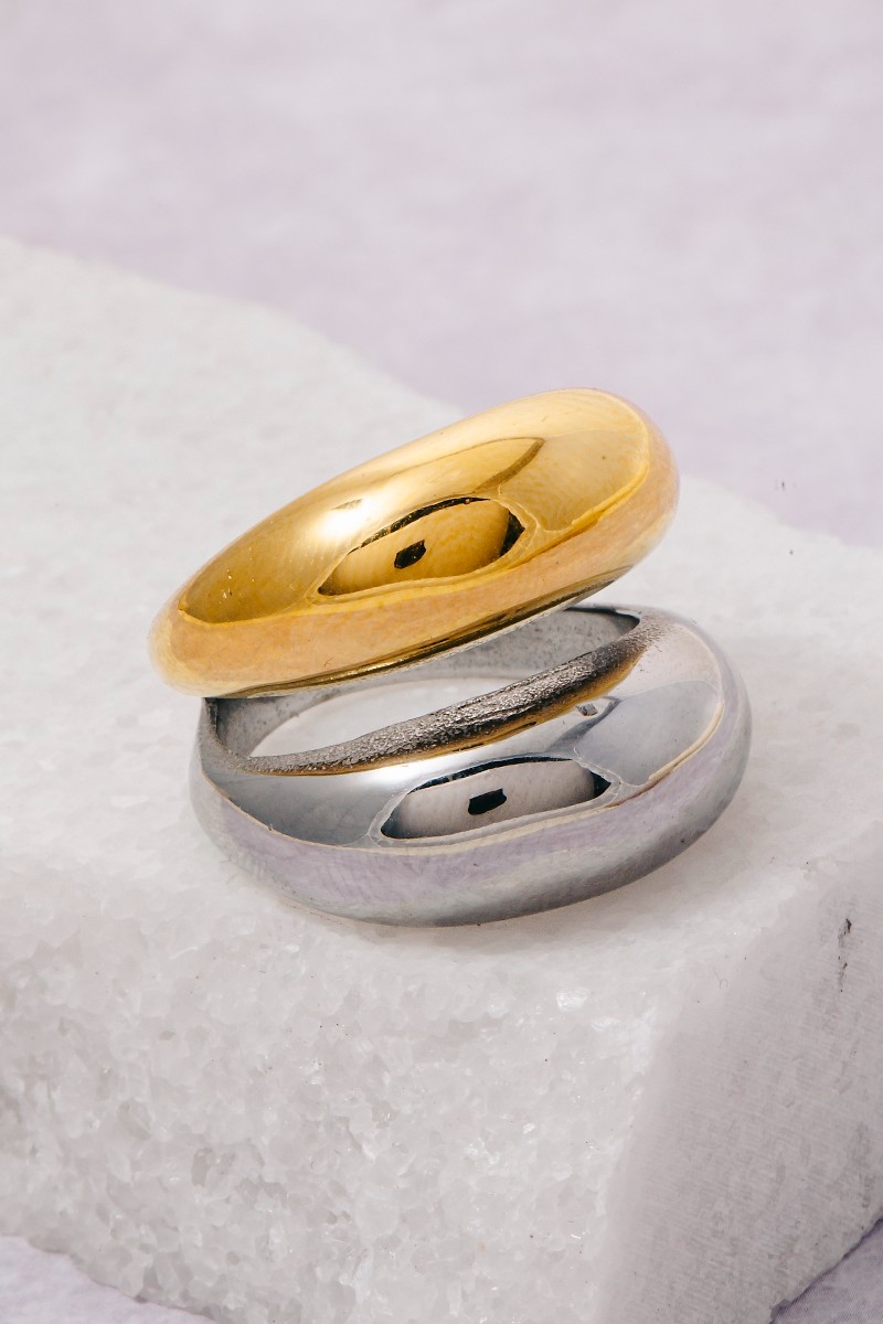 - This ring brings a stunning stainless steel two tone solid layered band style. Redefine your look effortlessly with this standout, on-trend piece.