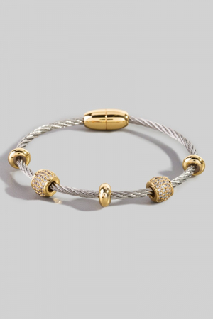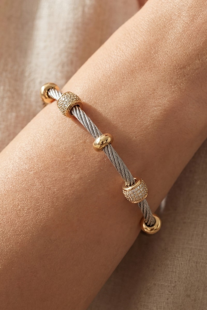 - This bracelet showcases a unique stainless steel two tone wire twist style. Discover the perfect balance of functionality and fashion.