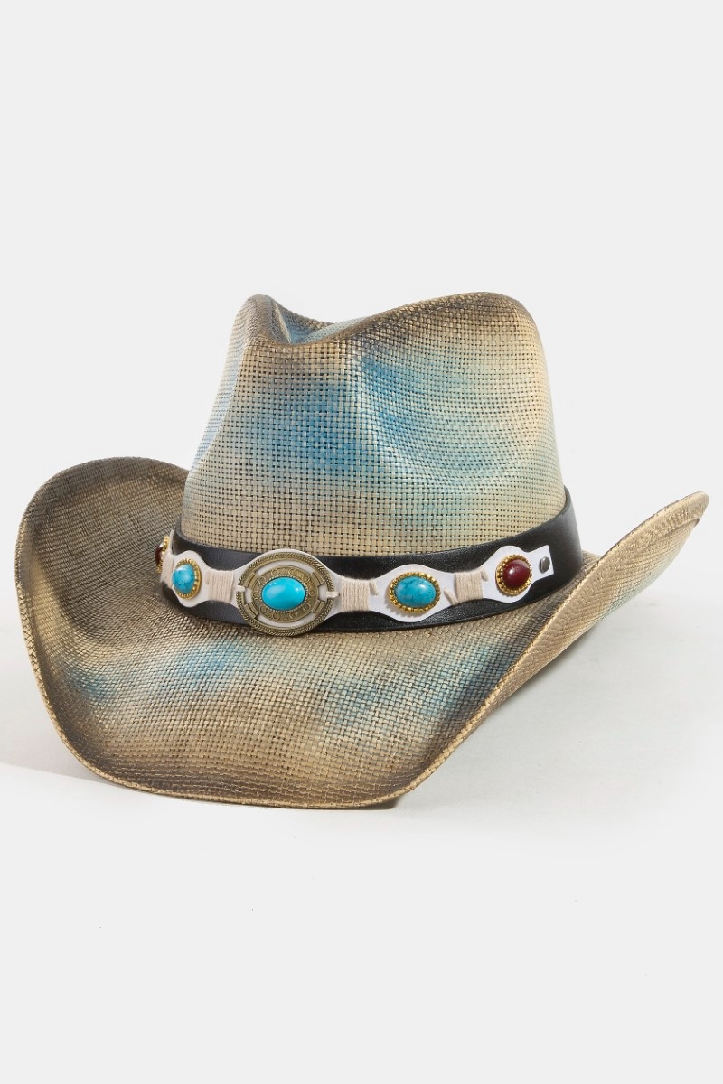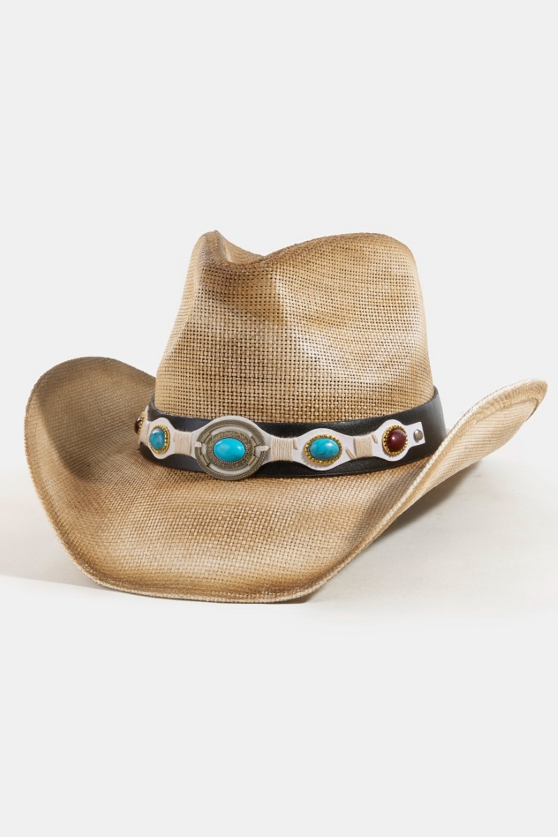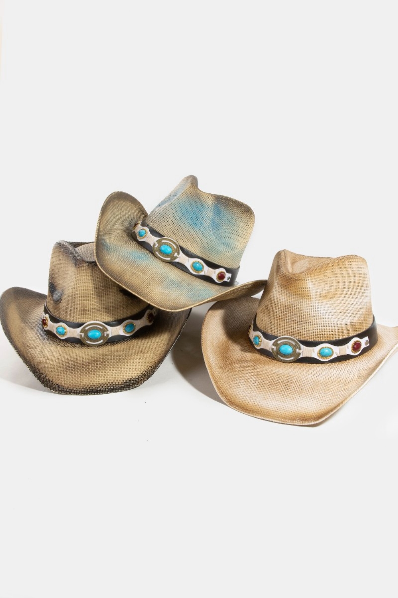 • This cowboy hat introduces a unique western turquoise stone strap straw style. Unveil modern elegance with this subtly intricate cowboy hat.