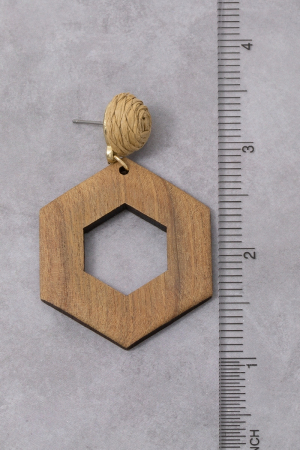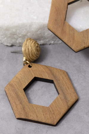 - This pair of dangle earrings features a fashionable wooden hexagon and straw post style. Witness the transformative power of accessories as this piece effortlessly redefines your fashion narrative.
