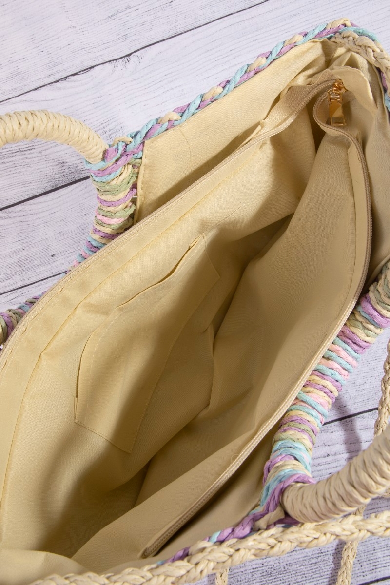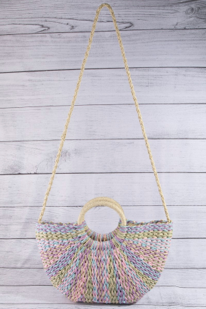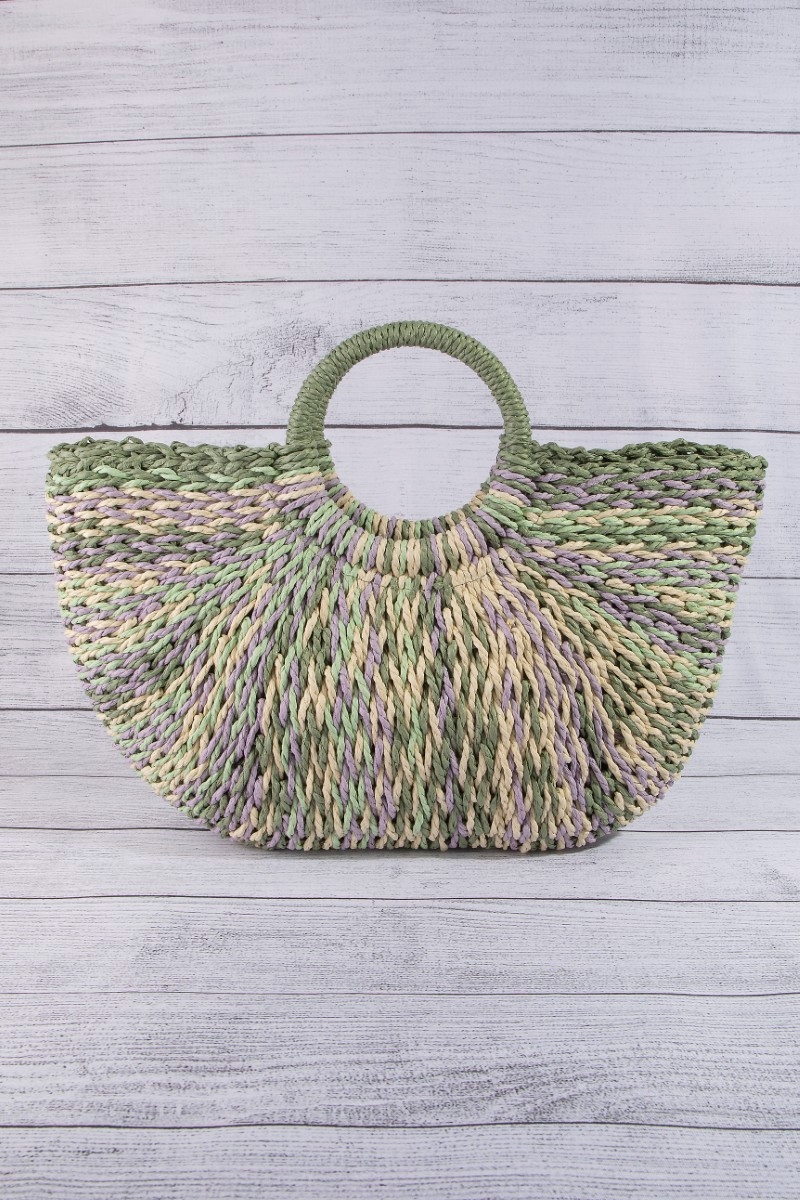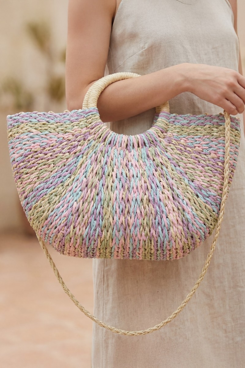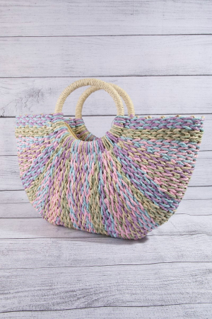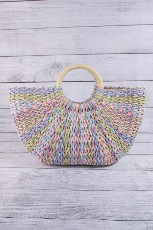 - This tote bag showcases a timeless multi tone straw half moon round handle style. Experience refined sophistication with this understated yet stylish piece.