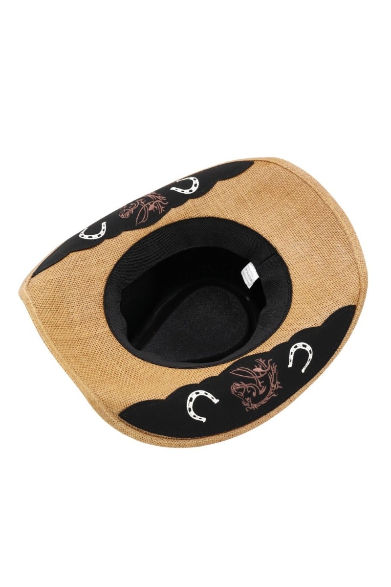 - This cowboy hat displays a vibrant western concho strap with under brim horse detail style. Elevate your ensemble with this chic, timeless cowboy hat.