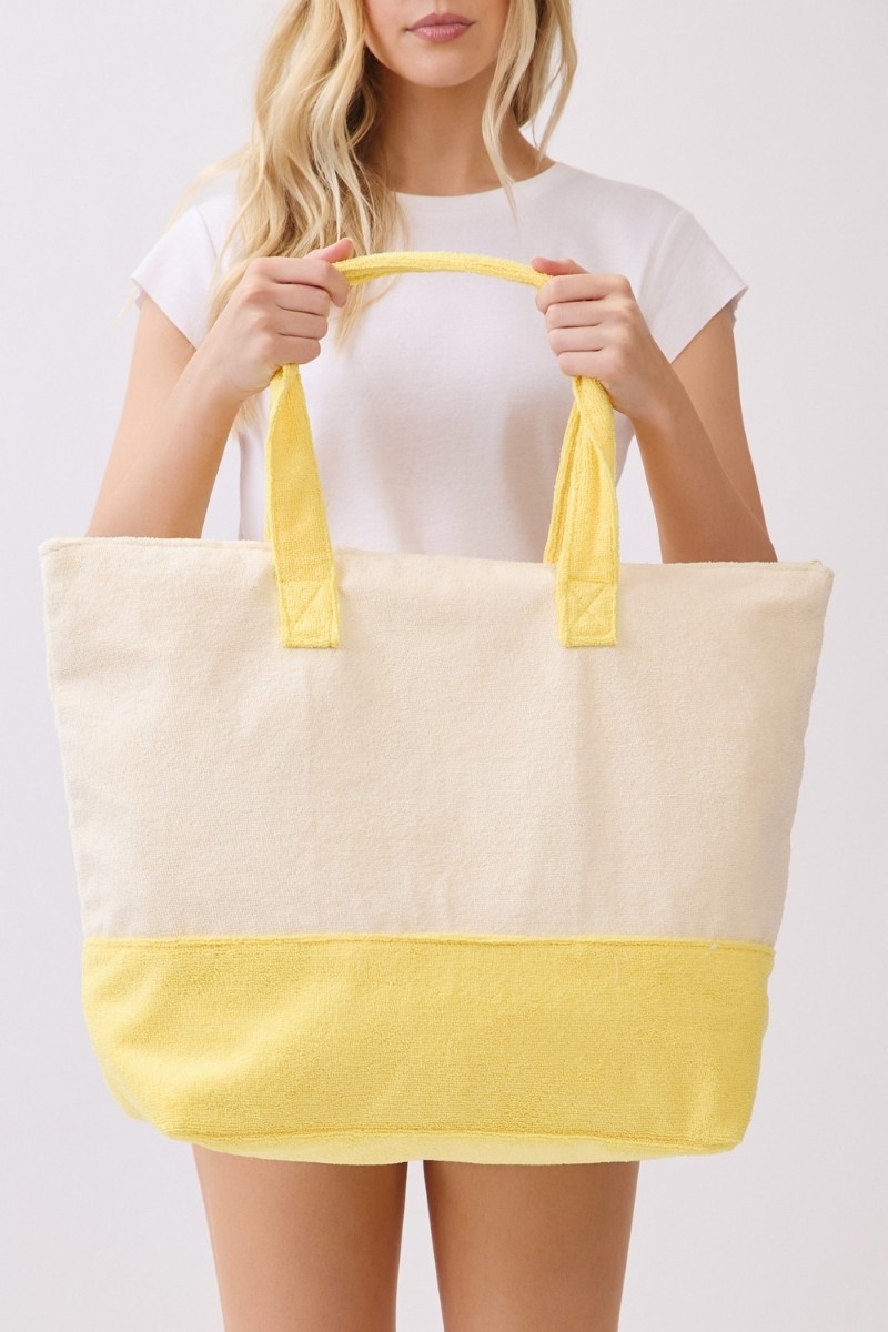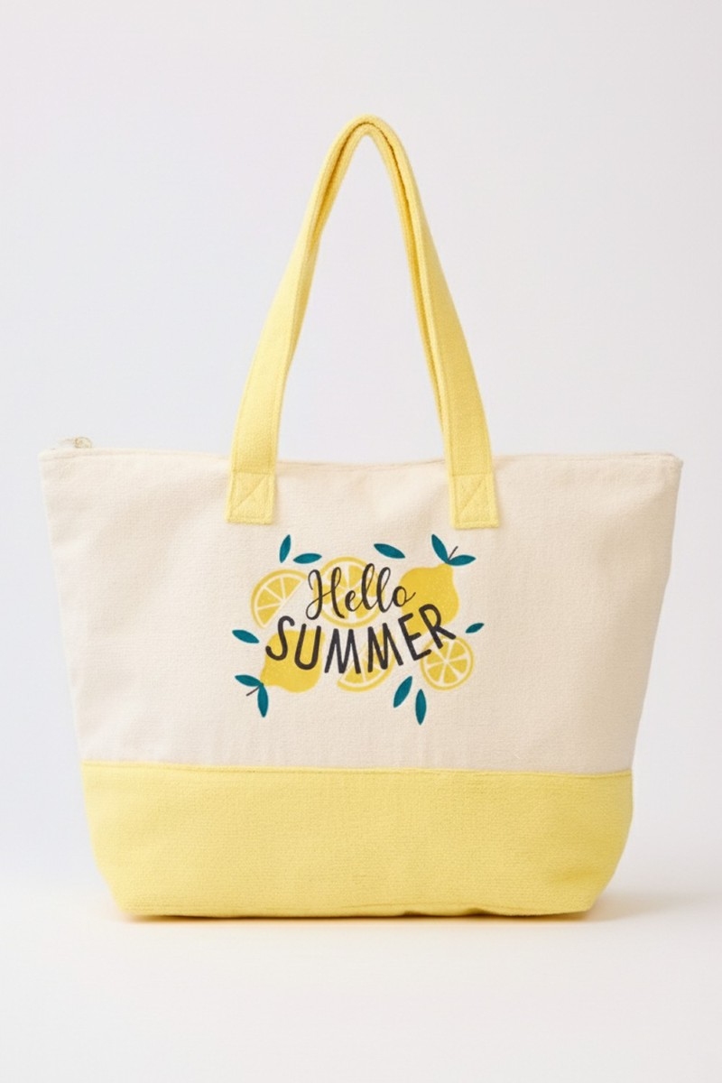 - This tote bag showcases a timeless hello summer lemon terry style. Celebrate individual style with this versatile, eye-catching addition.