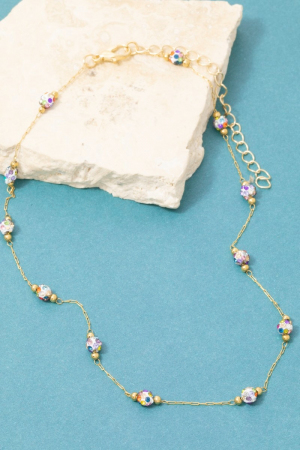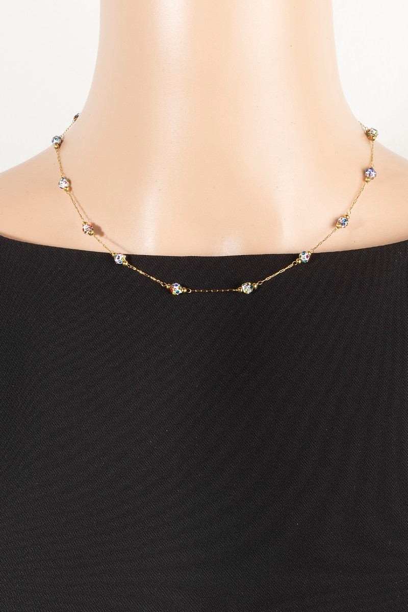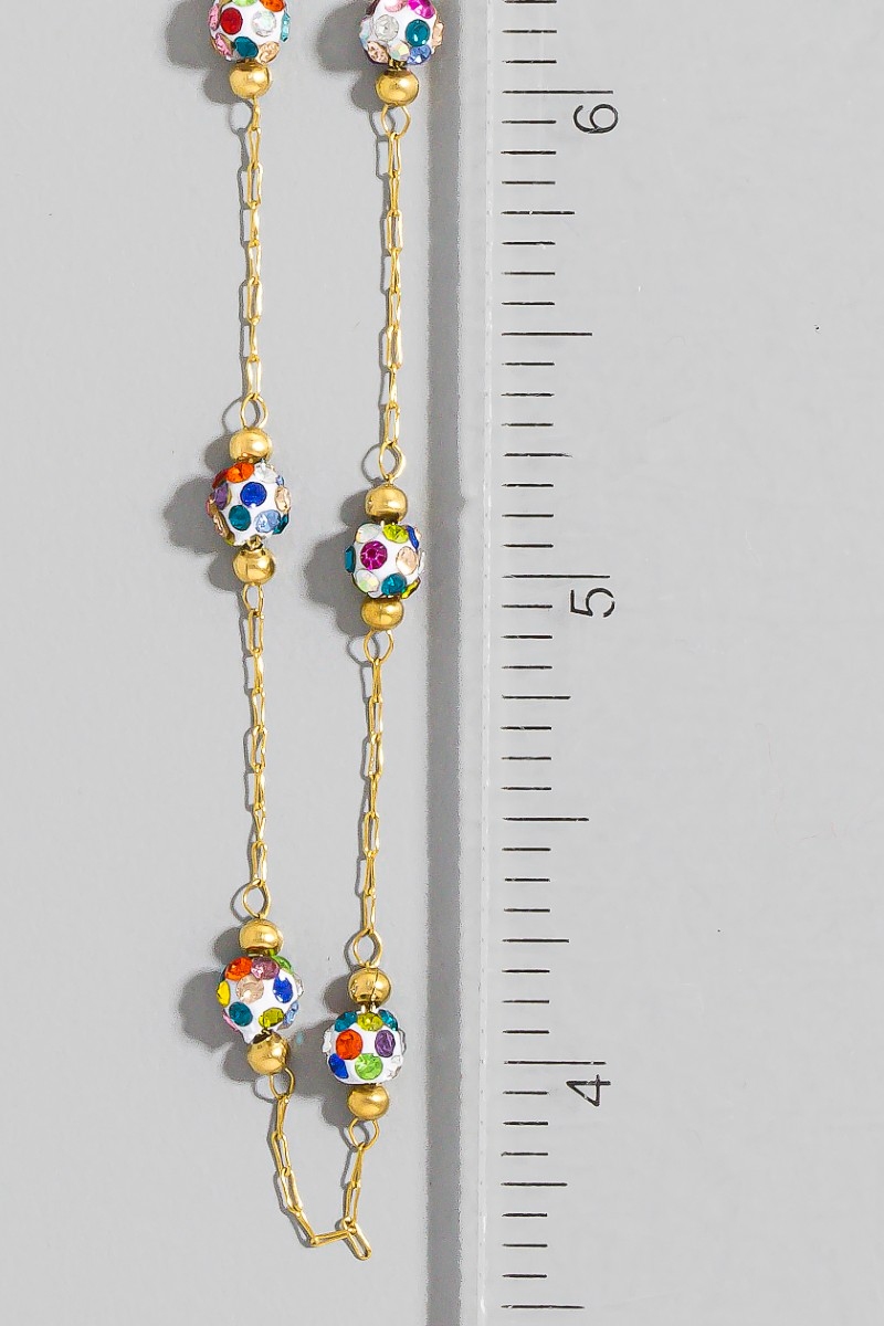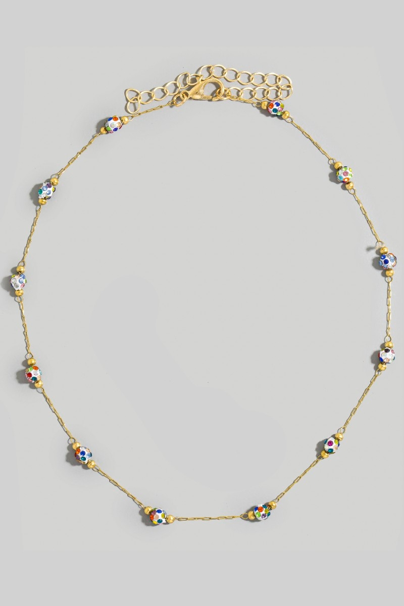 • This necklace displays a vibrant colorful studded ball bead station style. Explore a blend of classic charm and contemporary flair.