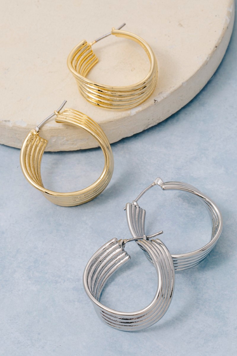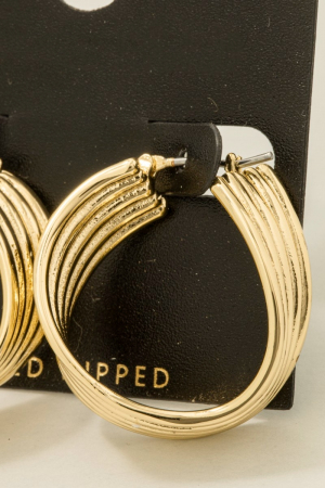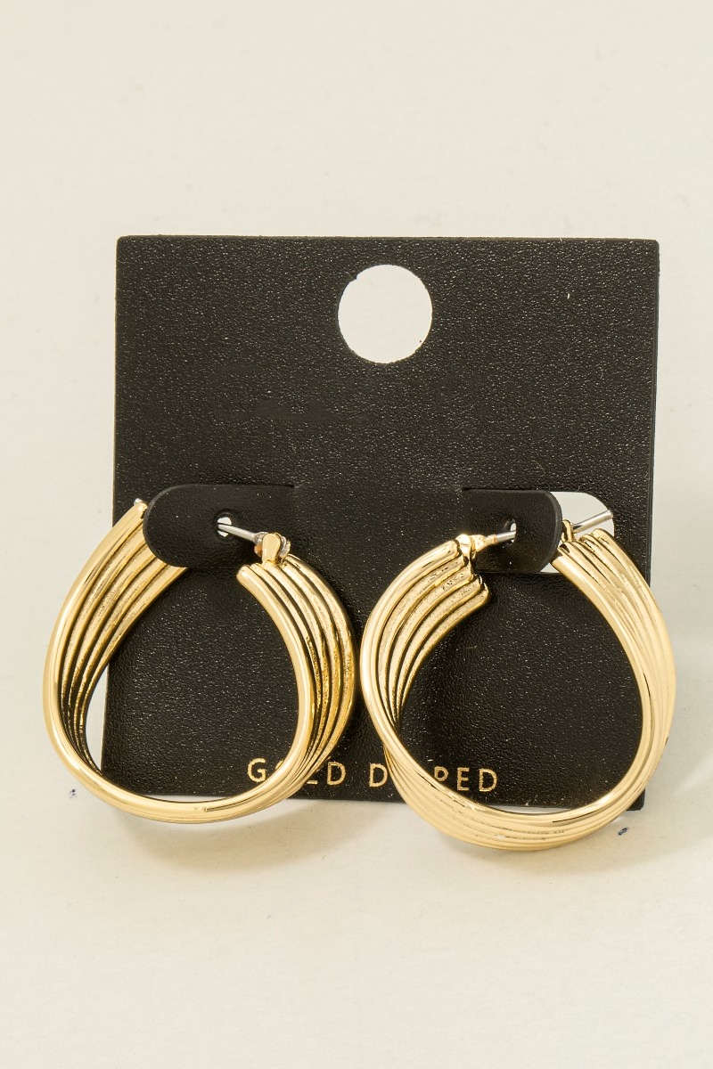 • This pair of hoop earrings brings a unique gold dipped 5 row layered wavy style. Indulge in the artistry of accessorizing with this unique piece.