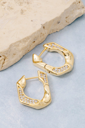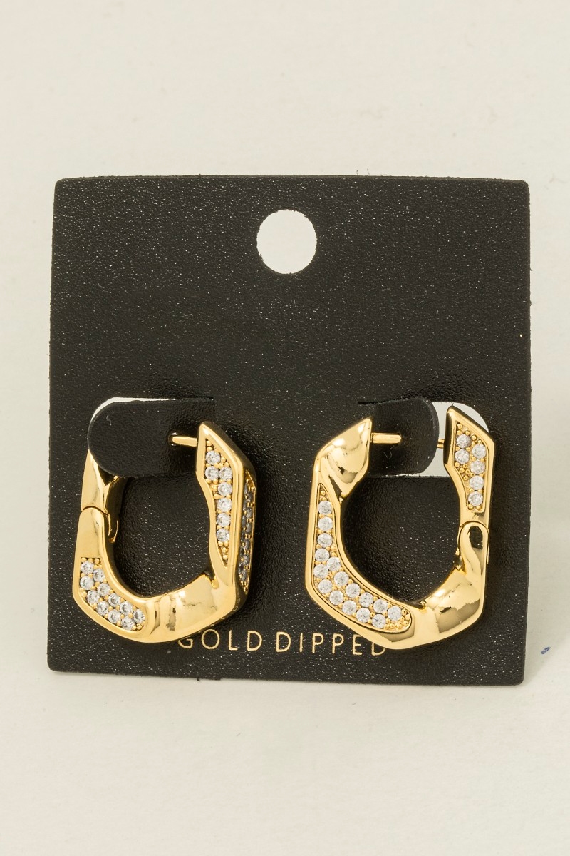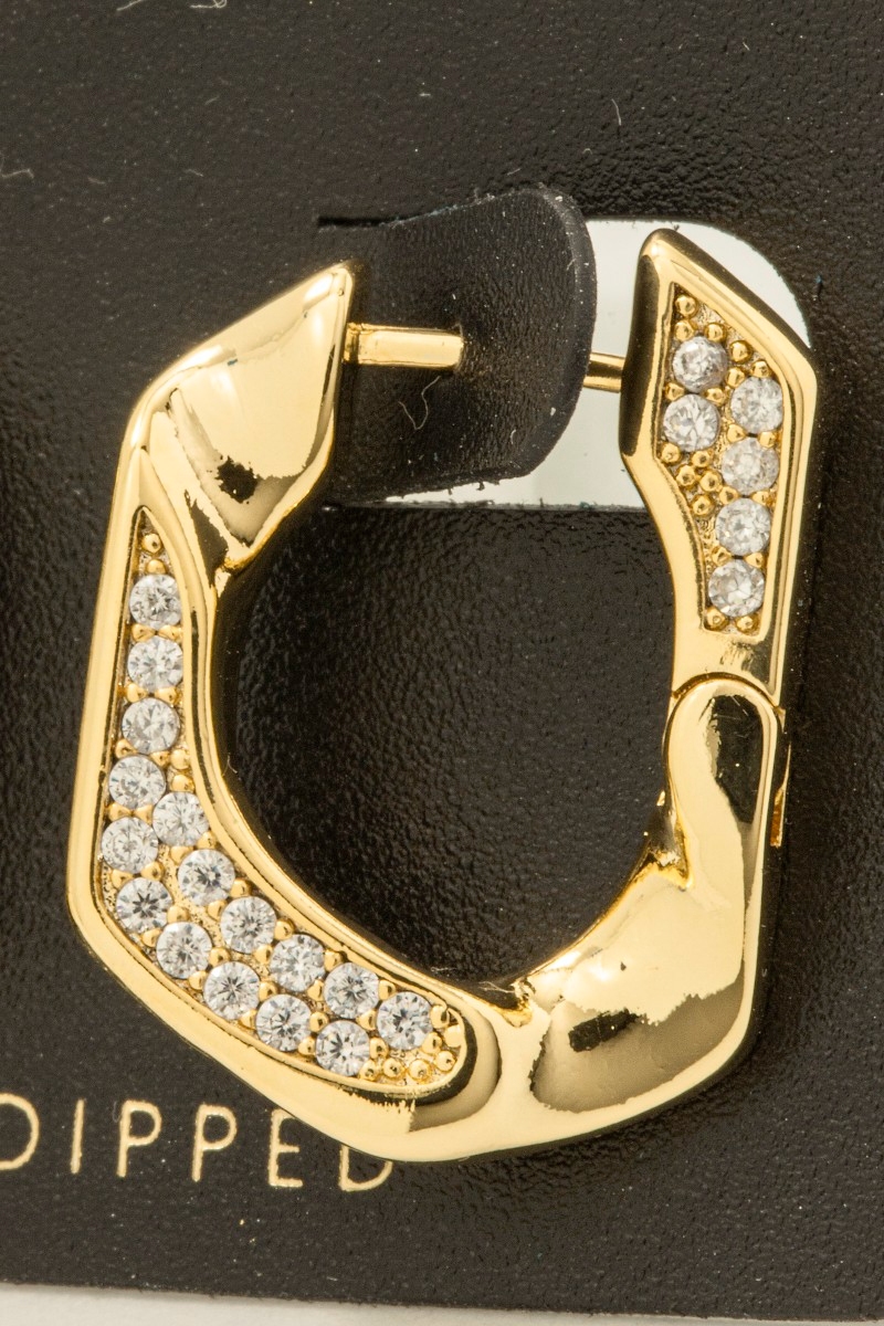 • This pair of hoop earrings brings a unique gold dipped cubic zirconia pave single curb link style. Savor the allure of detailed craftsmanship in this exquisite pair of hoop earrings.