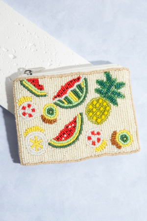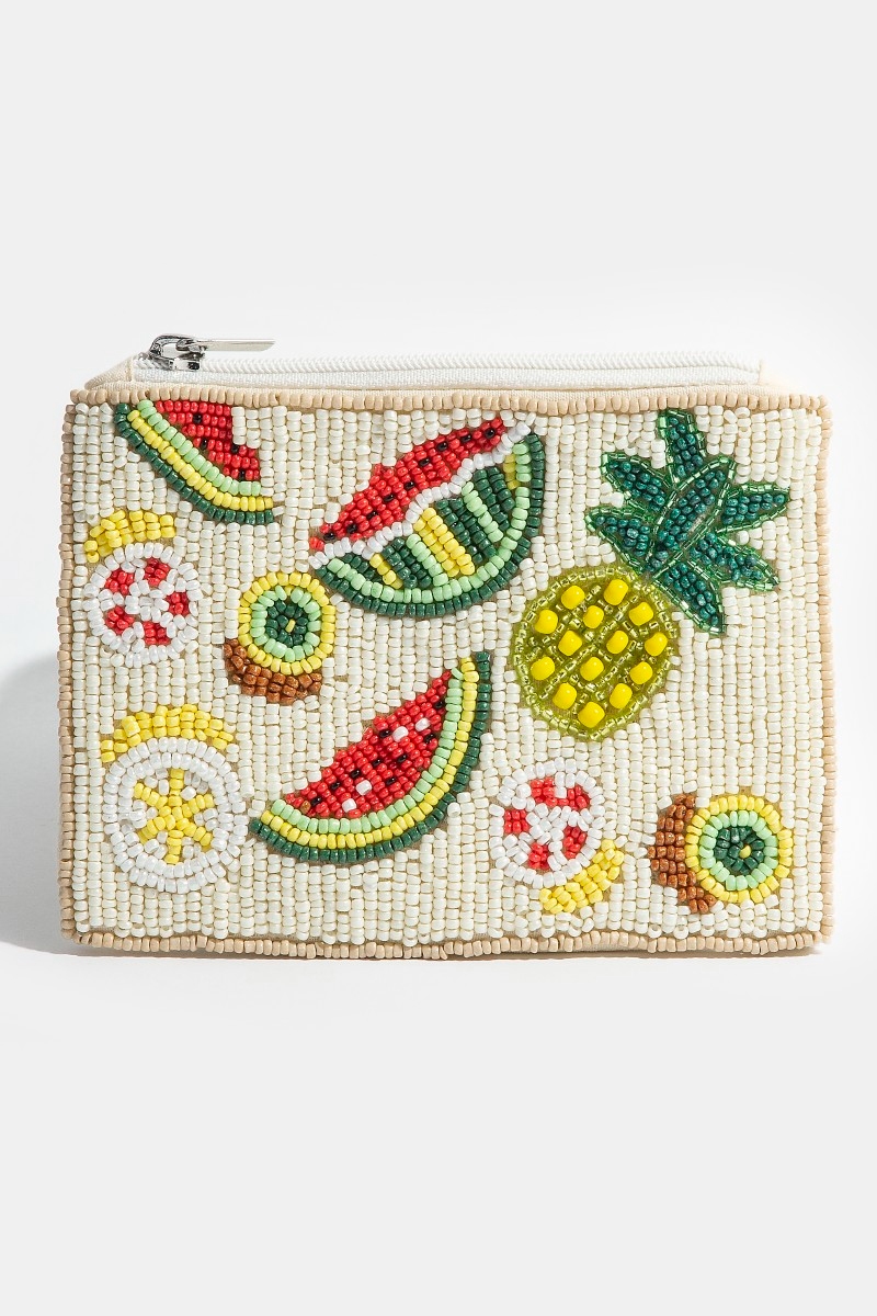 - This coin purse showcases a timeless seed beaded pineapple watermelon fruit style. Redefine your look effortlessly with this standout, on-trend piece.