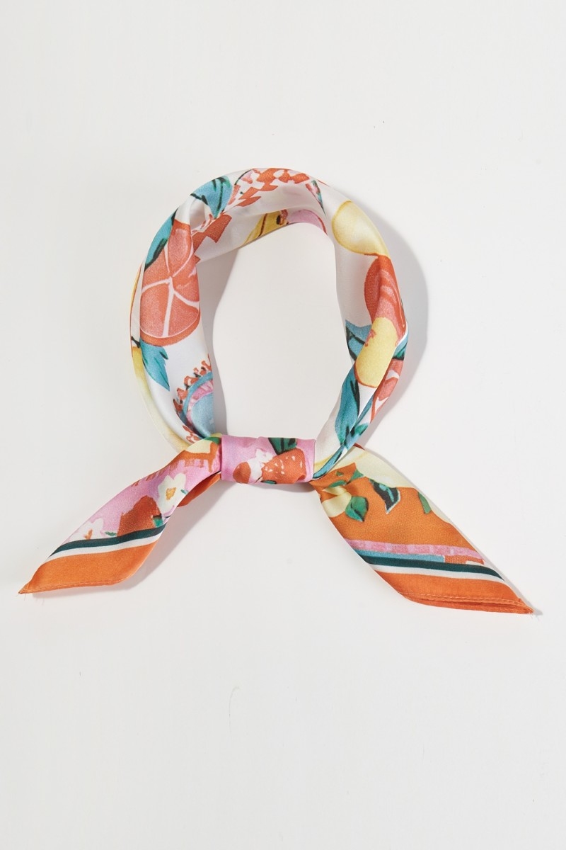 • This scarf features a fashionable tropical fruit print bandana style. Explore a blend of classic charm and contemporary flair.