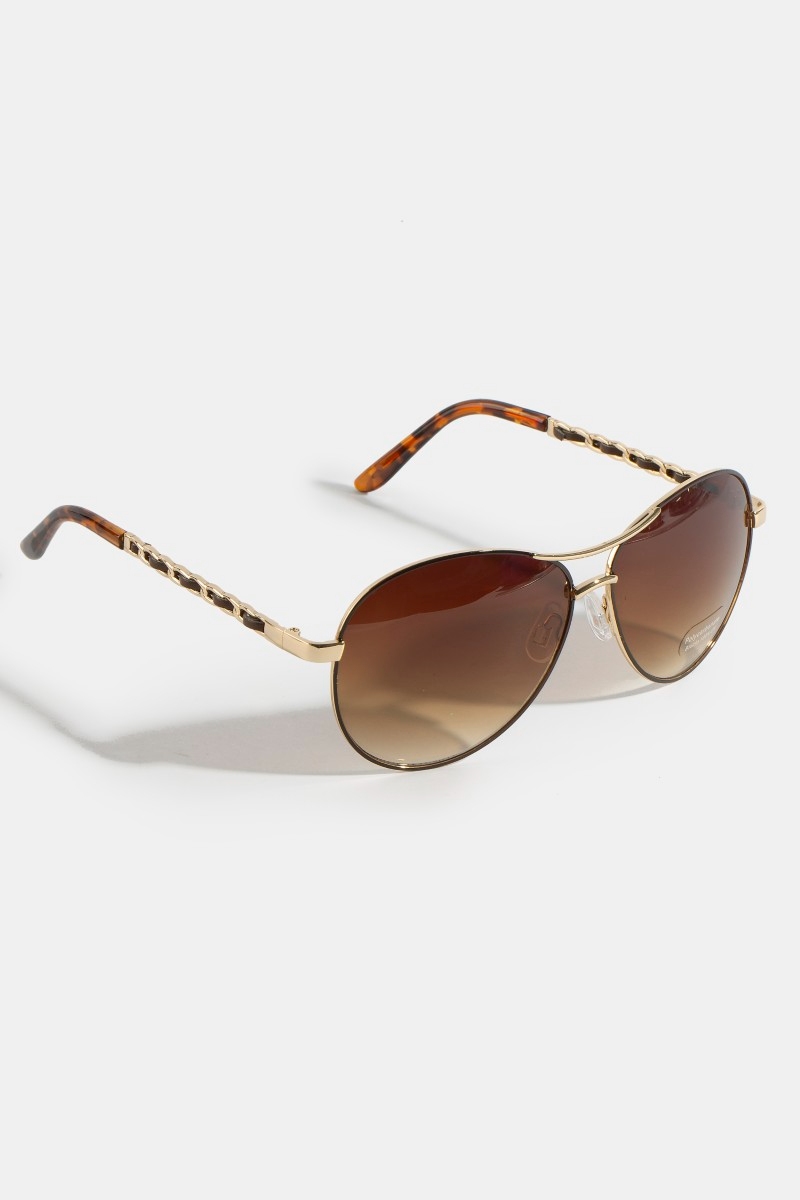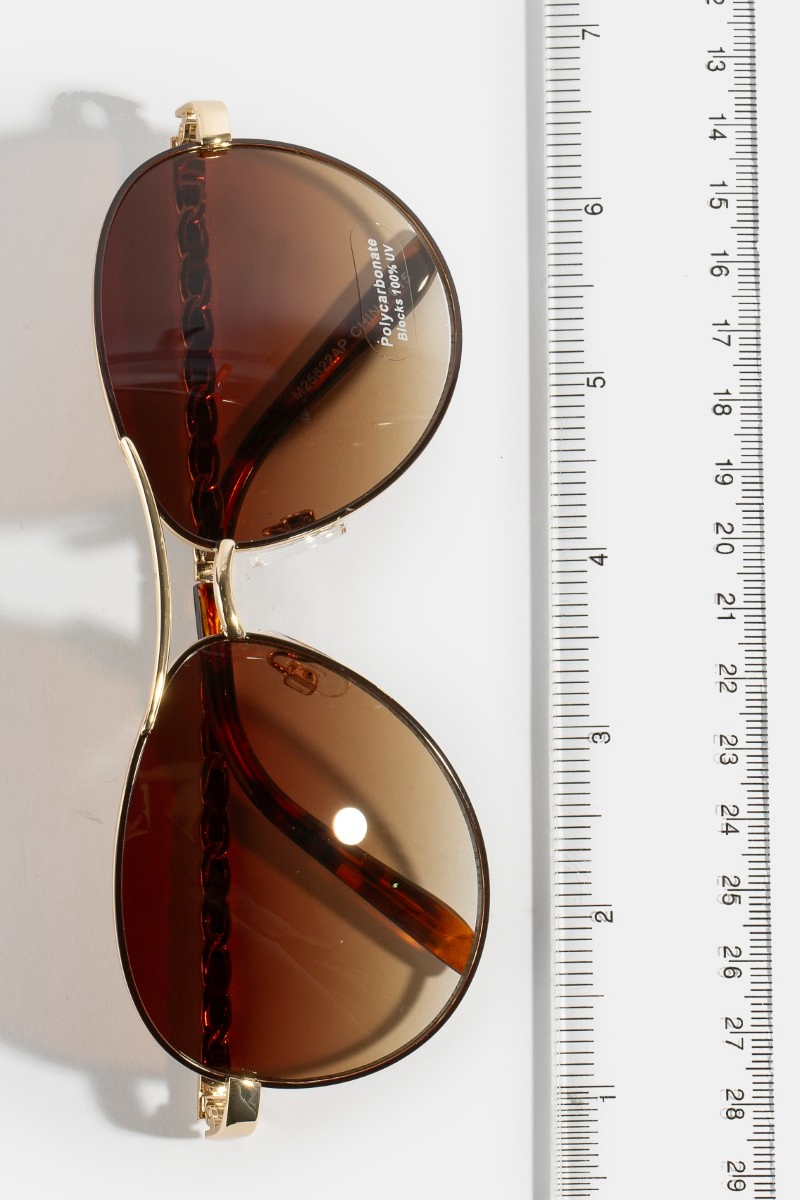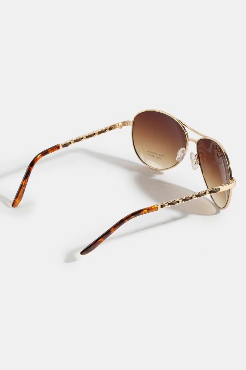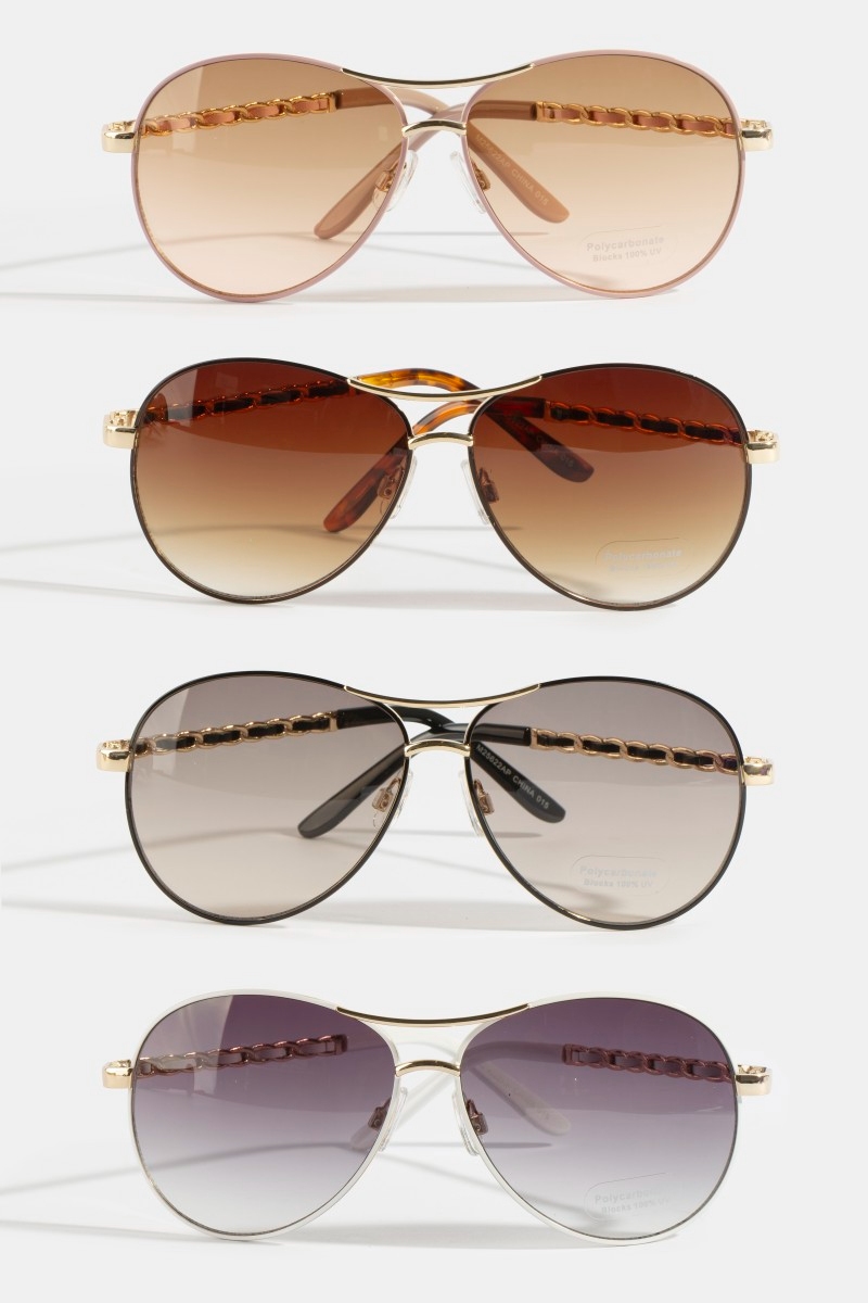 - This set of sunglasses introduces a unique aviator sunglasses with chain detail brow bar style. Savor the allure of detailed craftsmanship in this exquisite set of sunglasses.