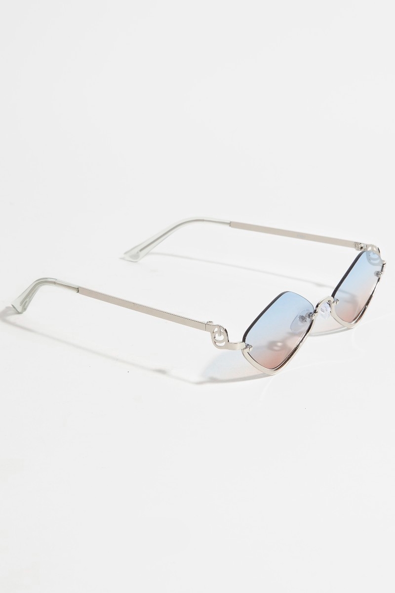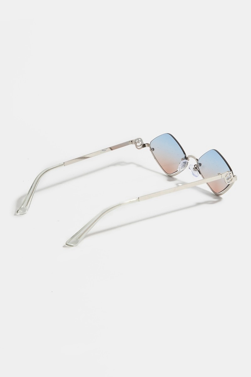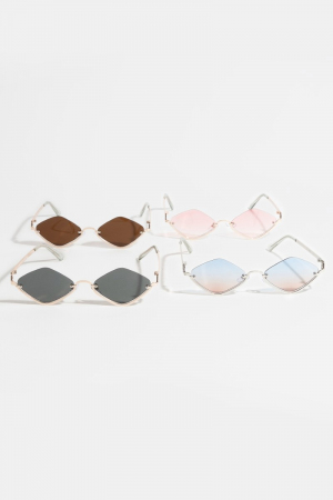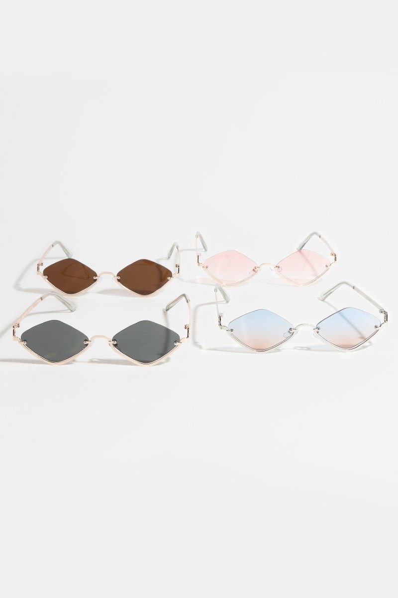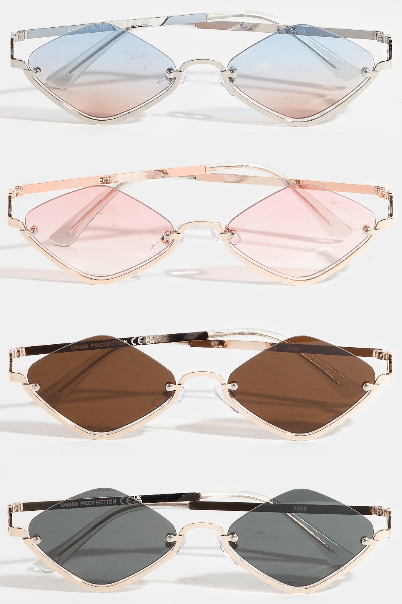 - This set of sunglasses displays a vibrant frameless diamond shaped sunglasses set style. Immerse yourself in the details of design, as this set of sunglasses effortlessly becomes a conversation starter.