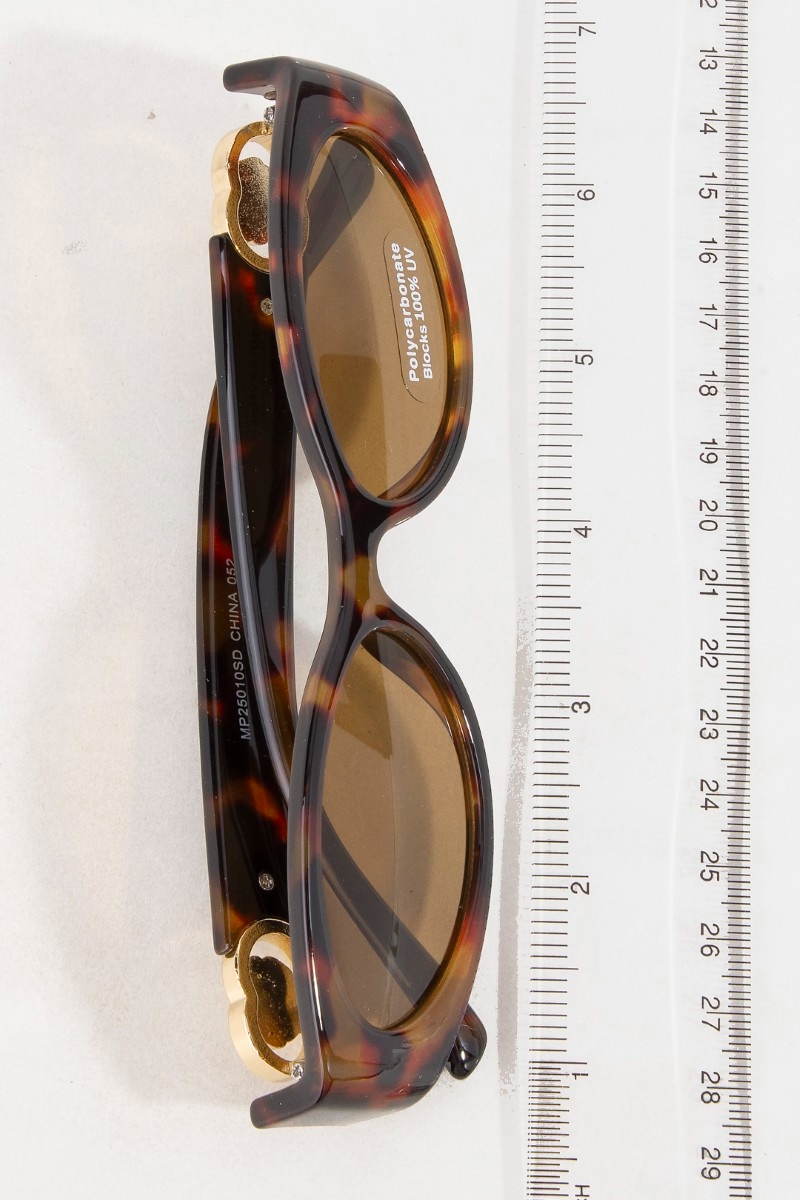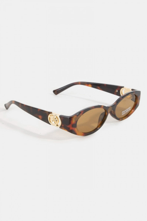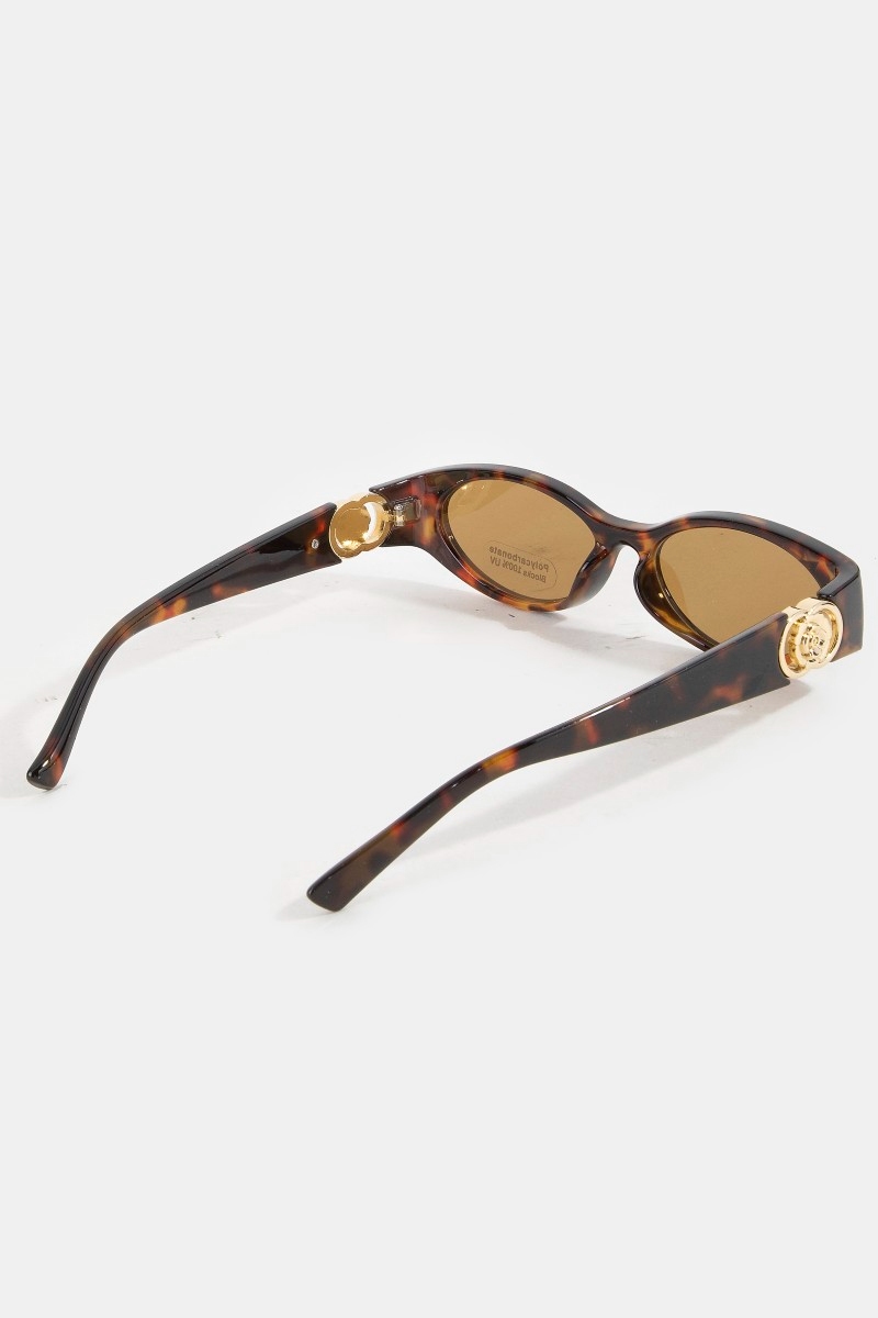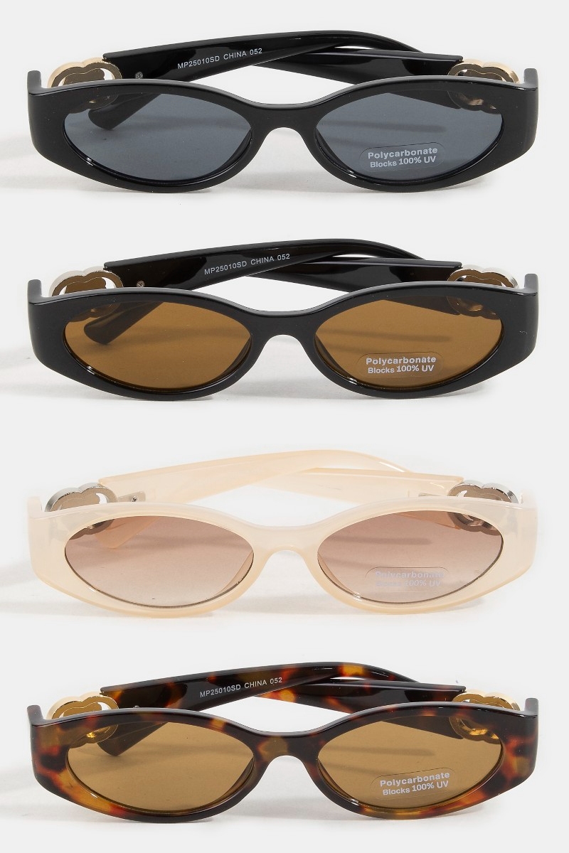- This set of sunglasses displays a fashionable narrow oval lens side gold detail sunglasses set style. Discover the perfect balance of subtlety and flair as this set of sunglasses effortlessly completes your look.