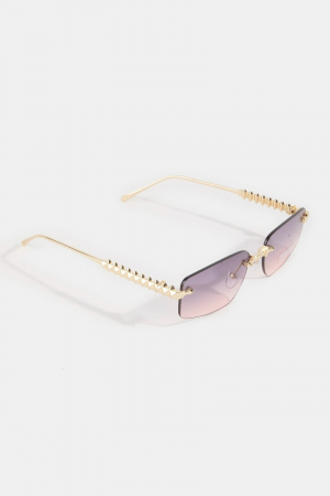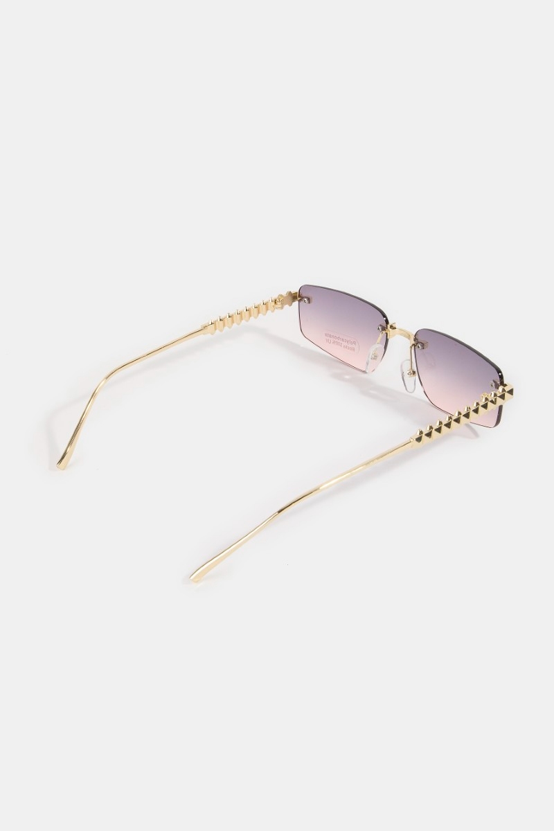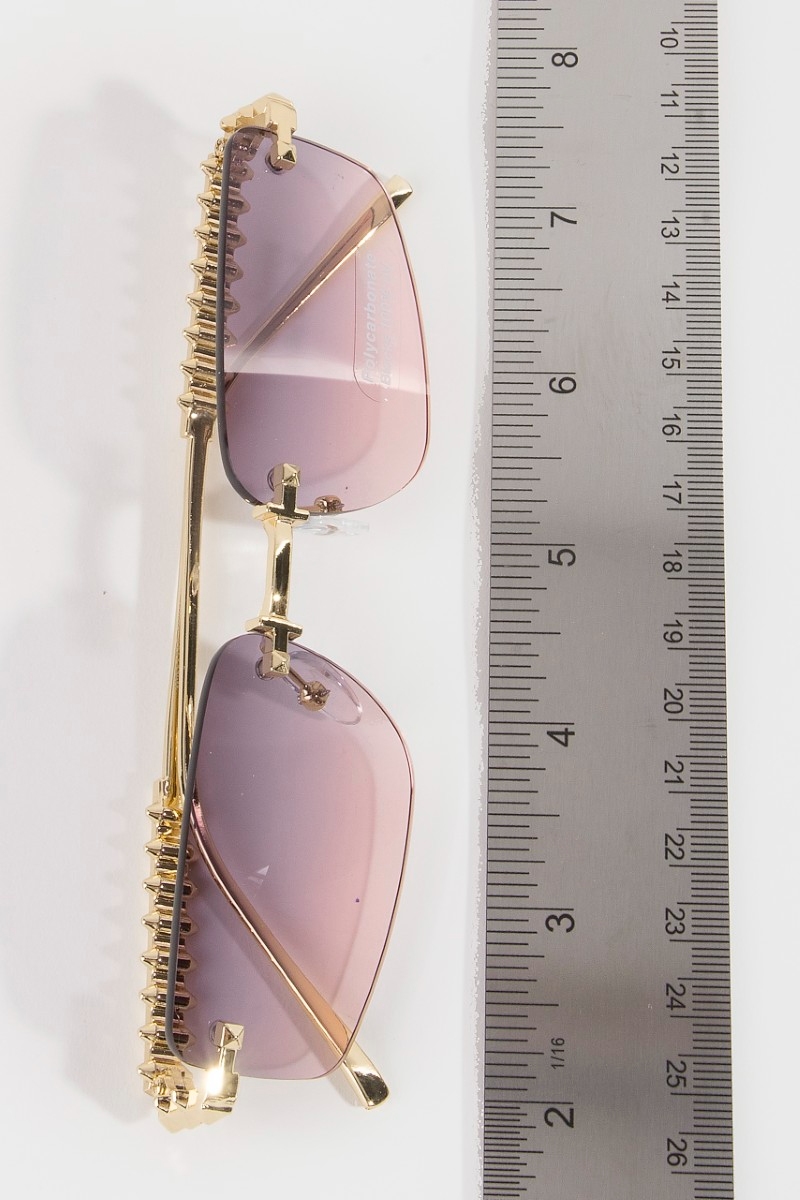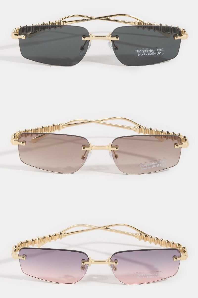 - This set of sunglasses adds a modern rimless rectangle spike studded top frame sunglasses style. Unveil modern elegance with this subtly intricate set of sunglasses.