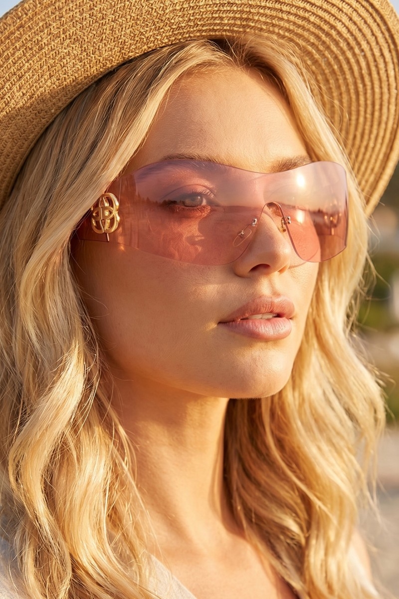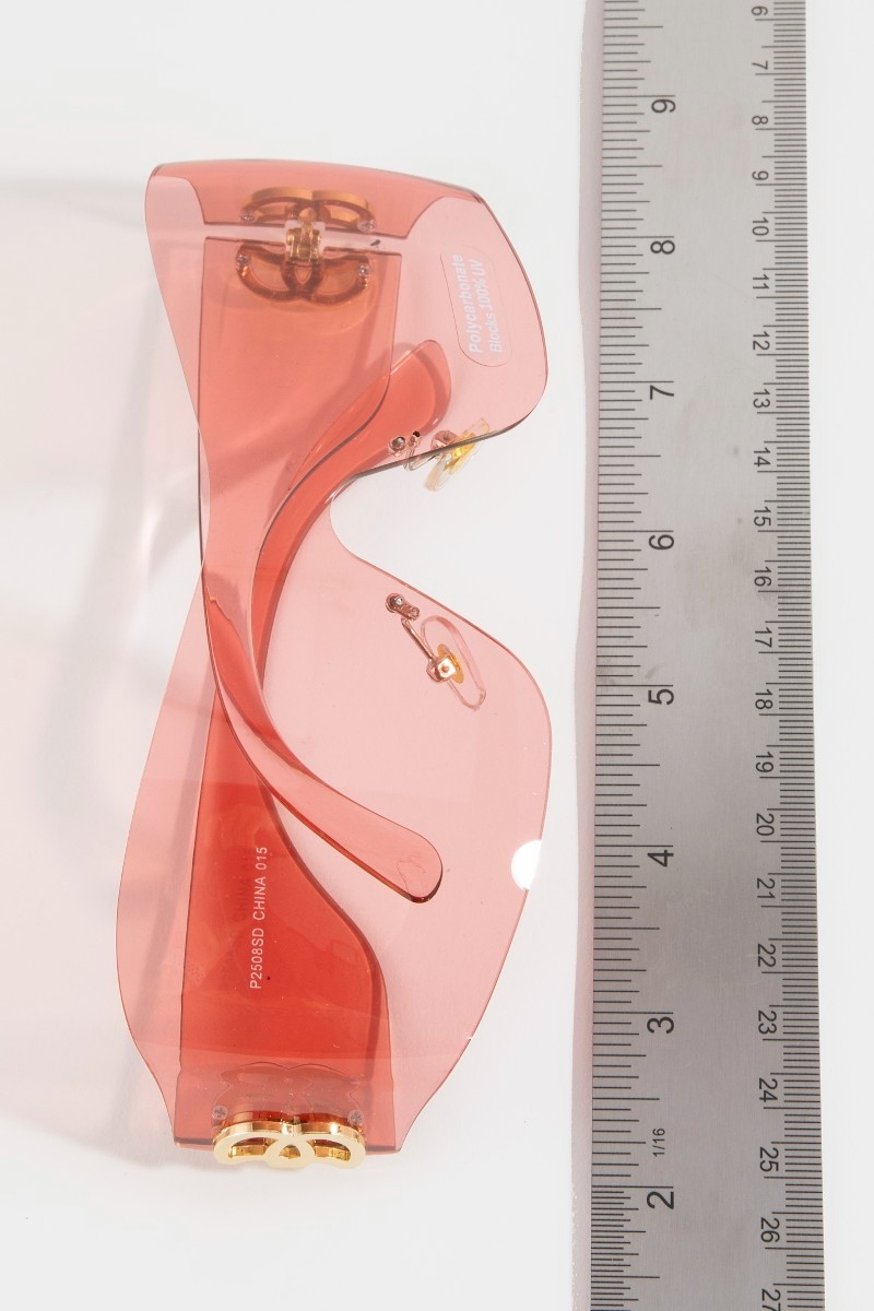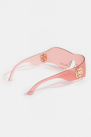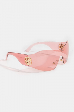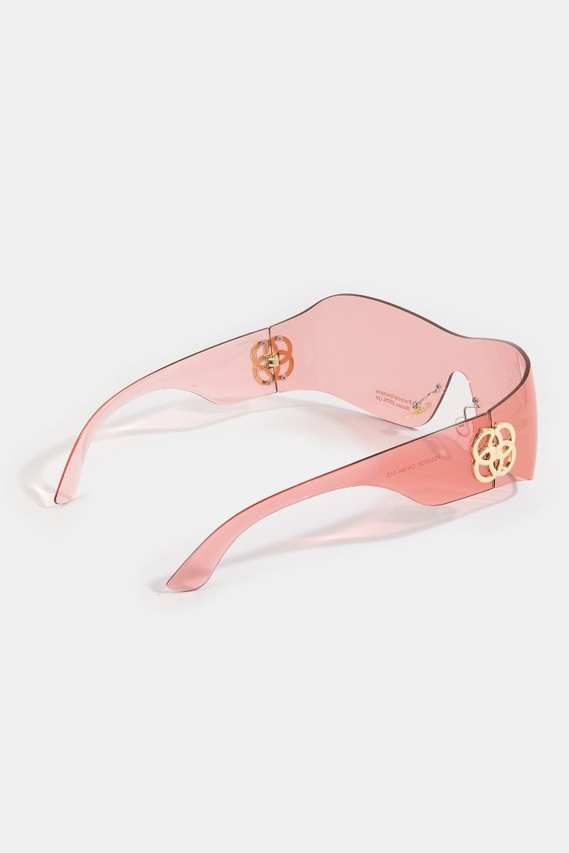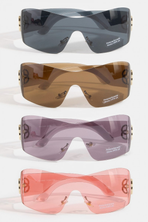 - This set of sunglasses brings a luxurious wrap shield sunglasses with side logo accent style. Delight in the nuanced details that make this set of sunglasses a testament to fine design and impeccable taste.