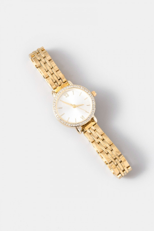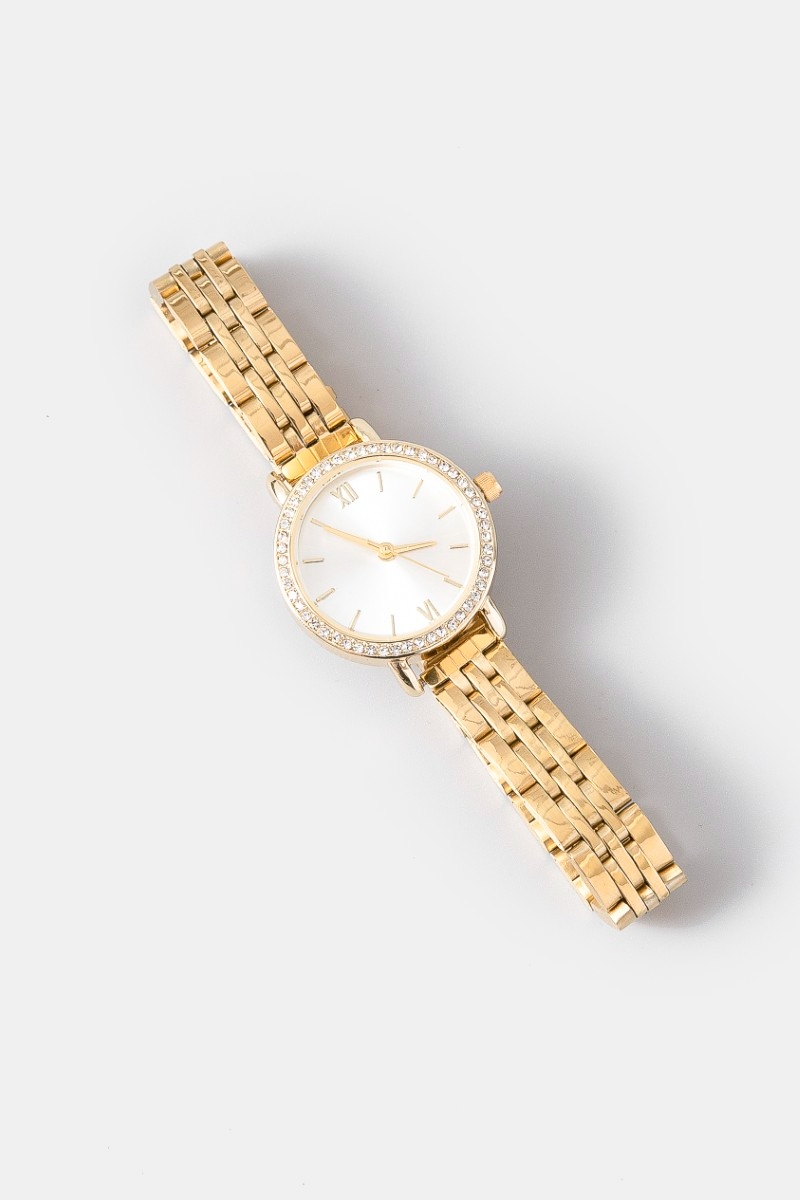 • This accessory introduces a unique cz pave trim round face watch style. Immerse yourself in the details of design, as this accessory effortlessly becomes a conversation starter.