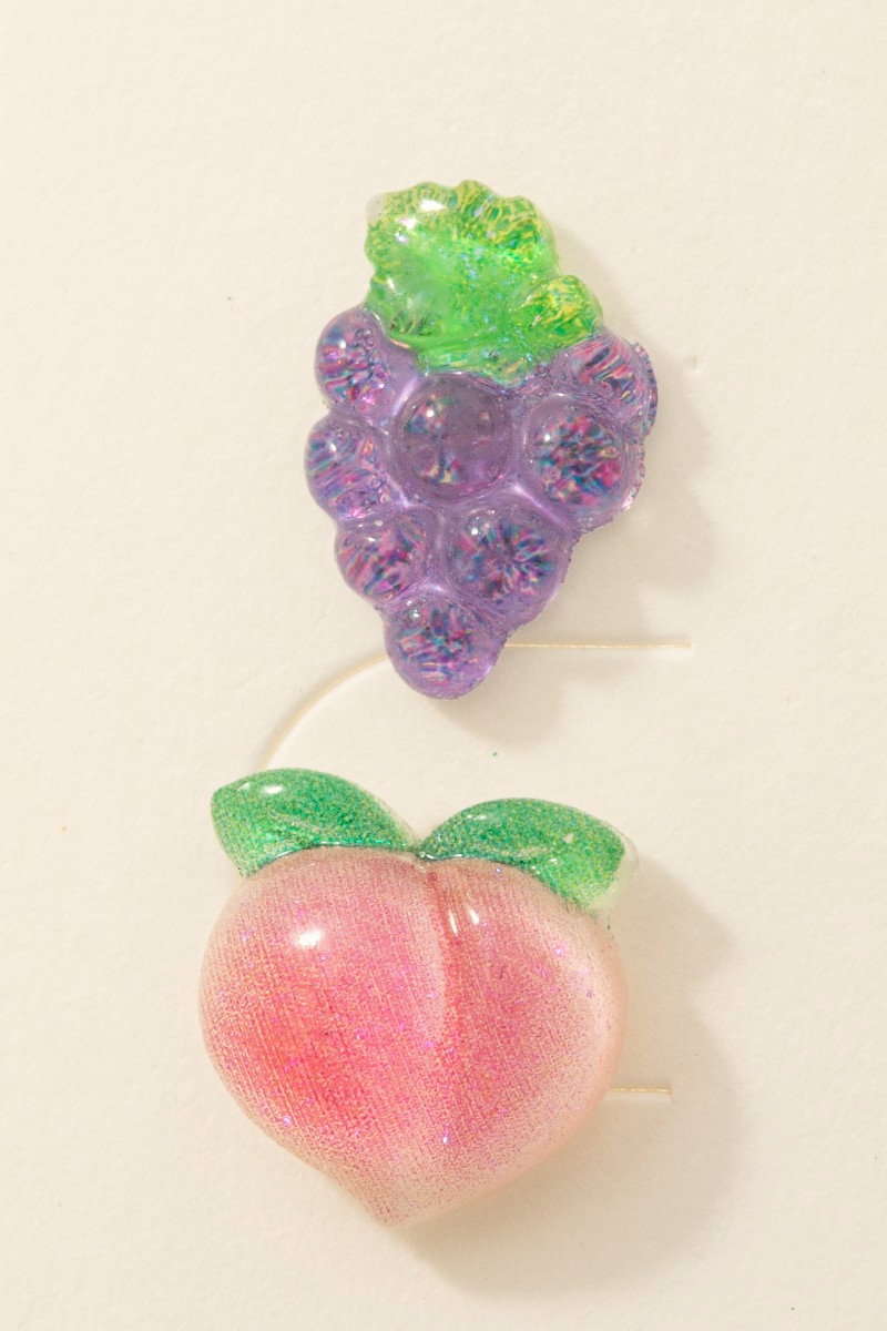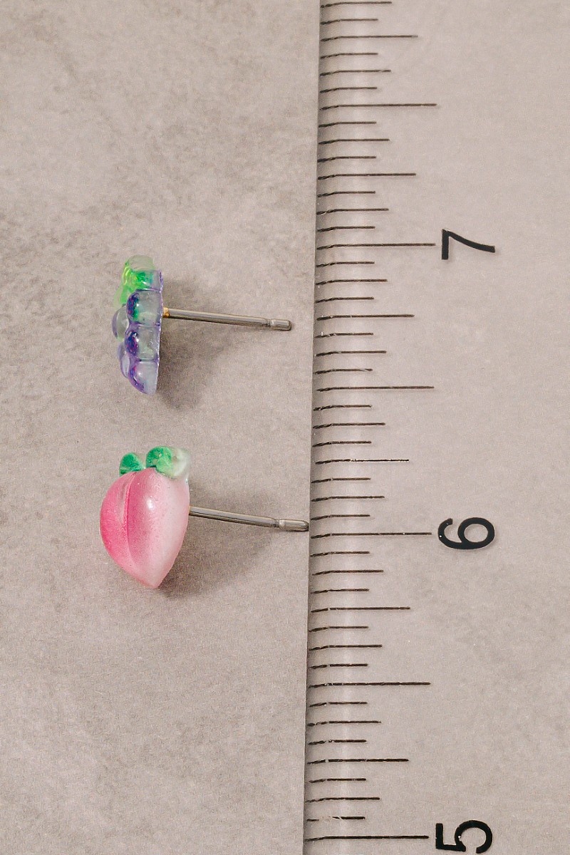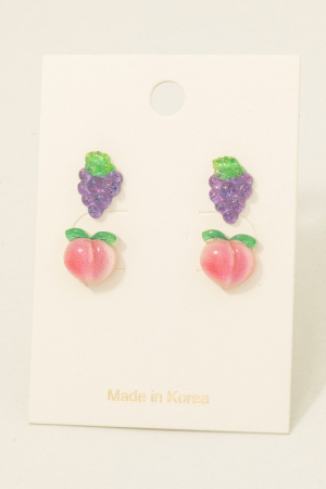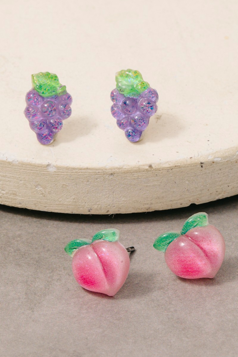 • This pair of stud earrings features a fashionable glitter acrylic peach and grapes set style. Explore a refined sense of style with this pair of stud earrings, seamlessly elevating the chic factor of your look.
