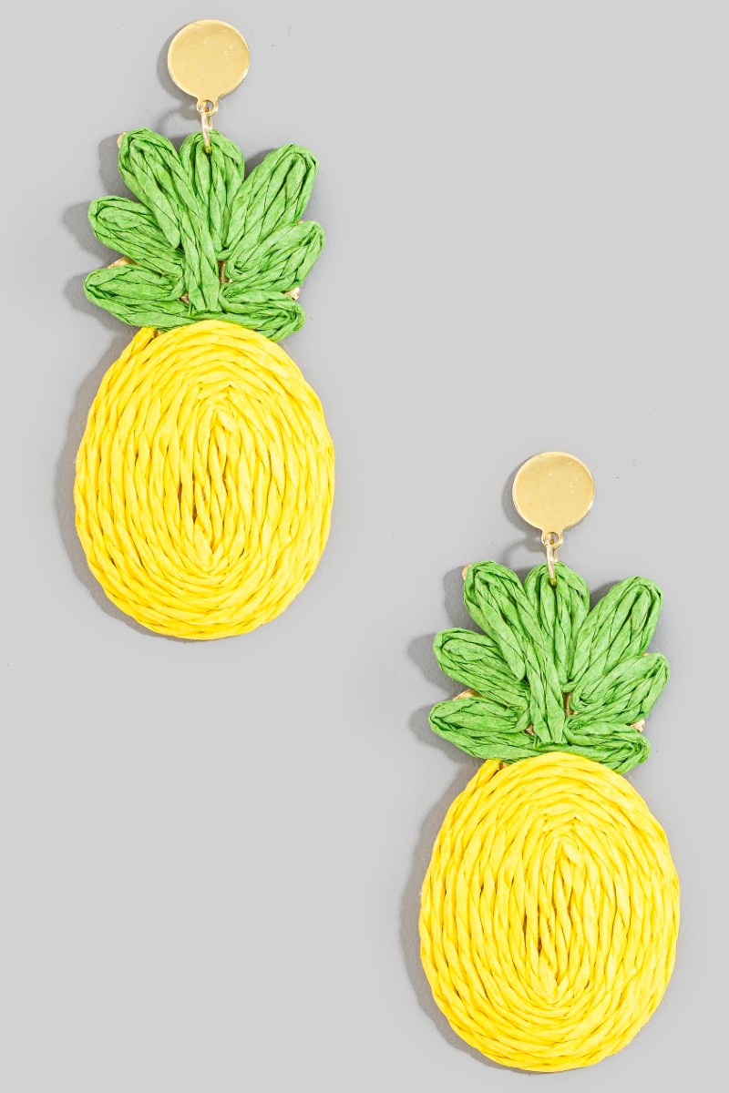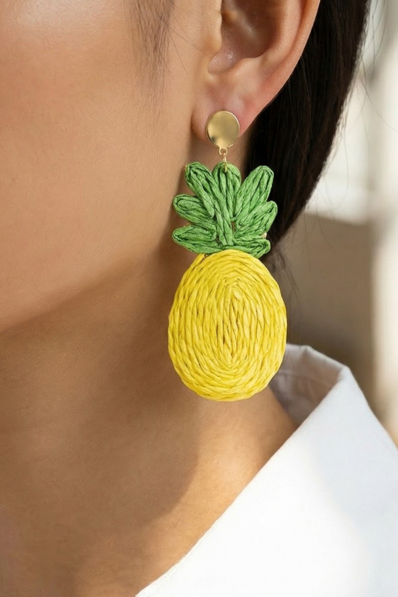 • This pair of dangle earrings brings a luxurious raffia wrap pineapple stud style. Unveil modern elegance with this subtly intricate pair of dangle earrings.