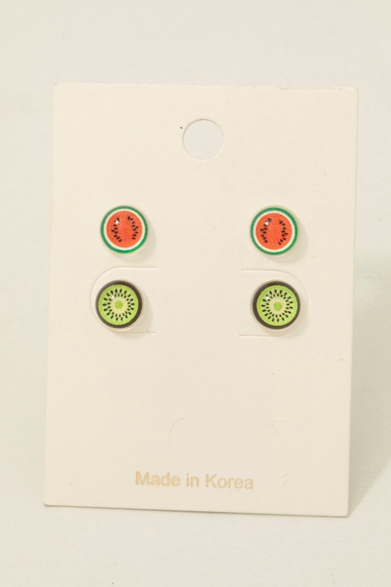 • This pair of stud earrings displays a vibrant watermelon and kiwi acrylic set style. Immerse yourself in the details of design, as this pair of stud earrings effortlessly becomes a conversation starter.