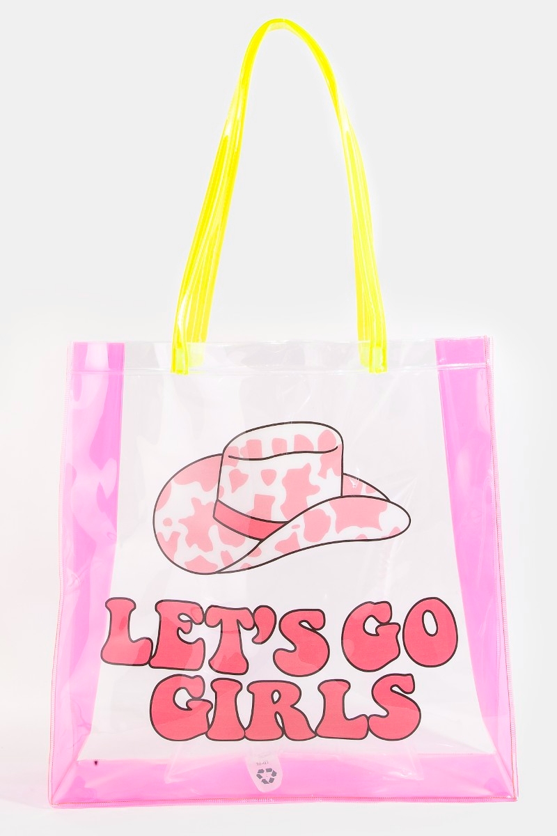 - This tote bag introduces a stunning western cowboy hat lets go girls print clear neon vinyl style. Immerse yourself in the world of understated glamour as this tote bag effortlessly exudes timeless appeal.