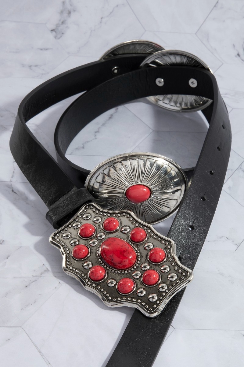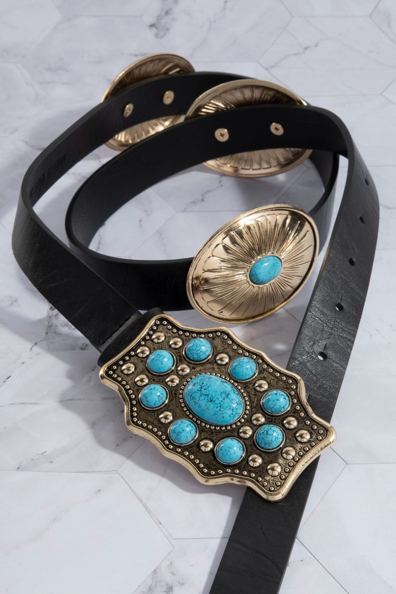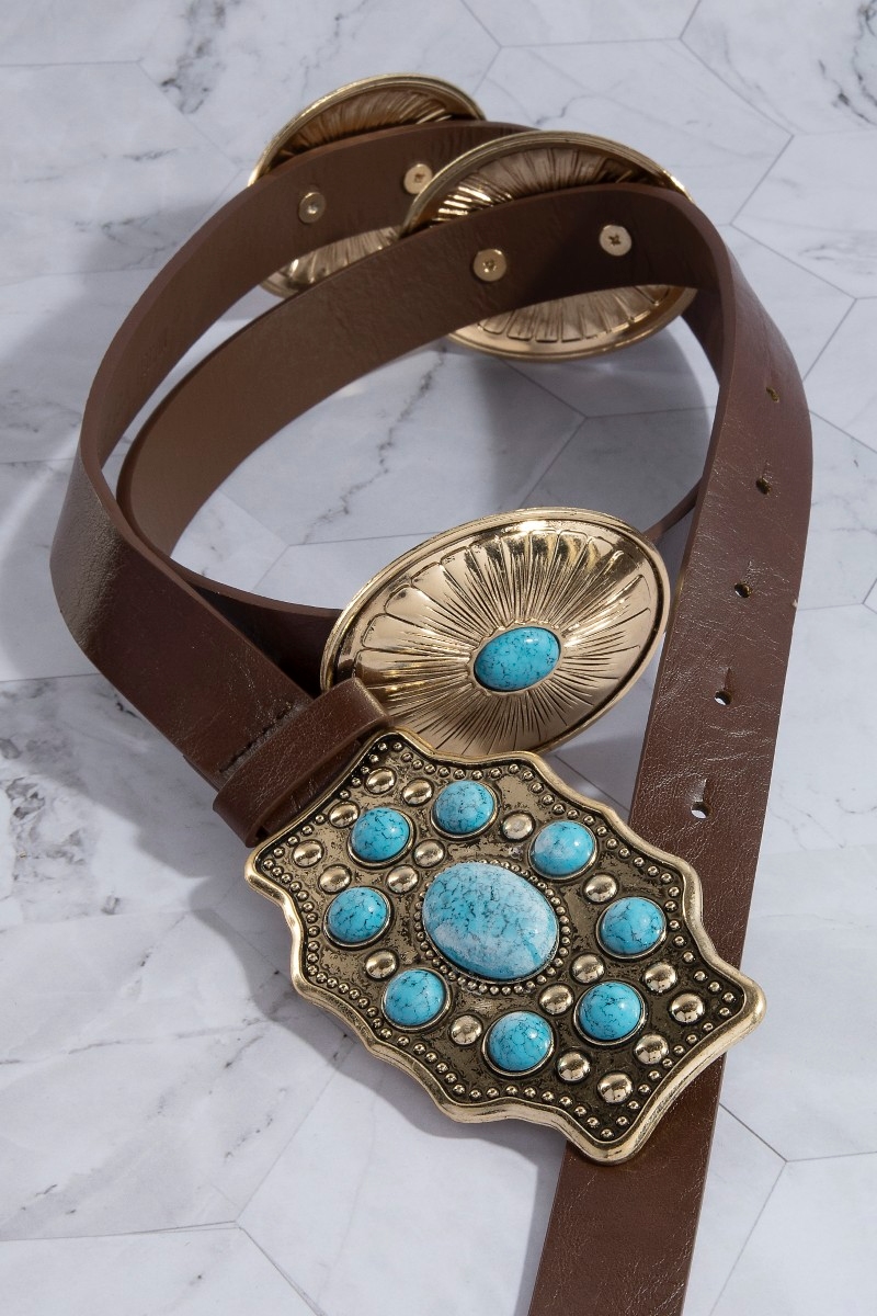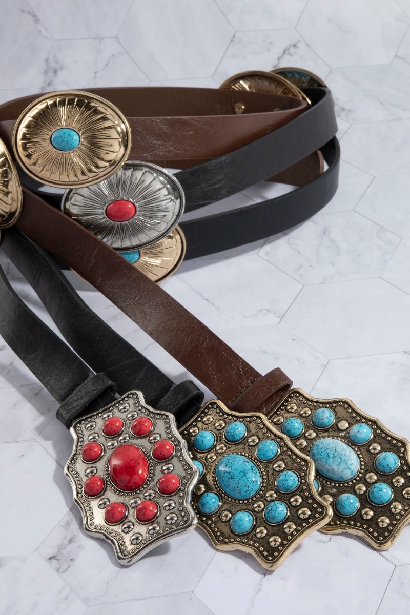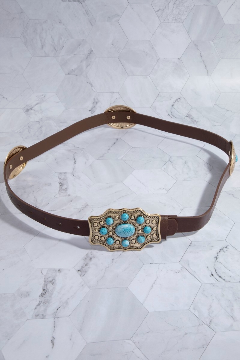 - This faux leather belt showcases a unique assorted western concho turquoise stone style. Celebrate individual style with this versatile, eye-catching addition.