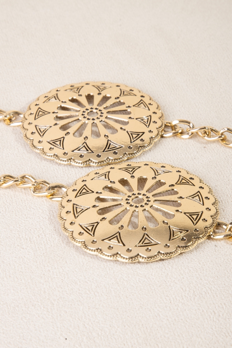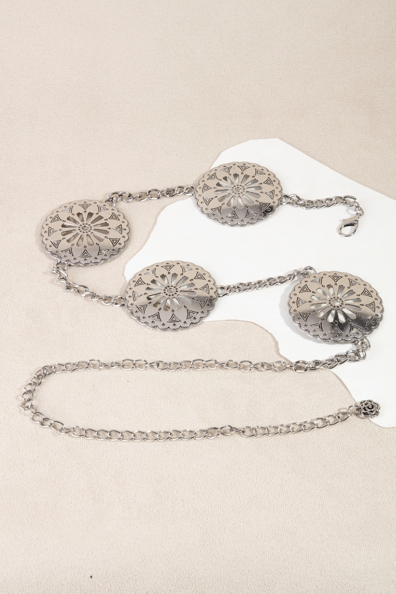 - This chain belt displays a vibrant large cut out discs western style. Witness the transformative power of accessories as this piece effortlessly redefines your fashion narrative.