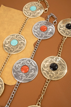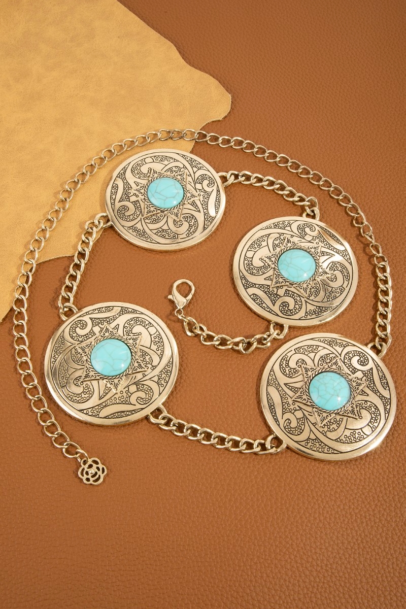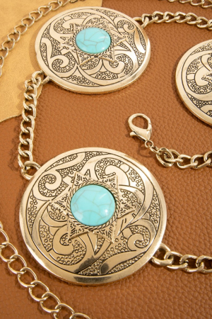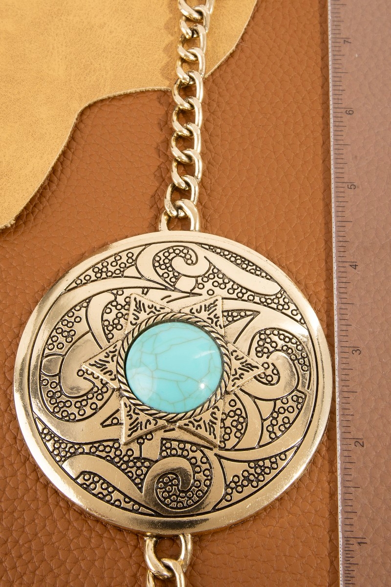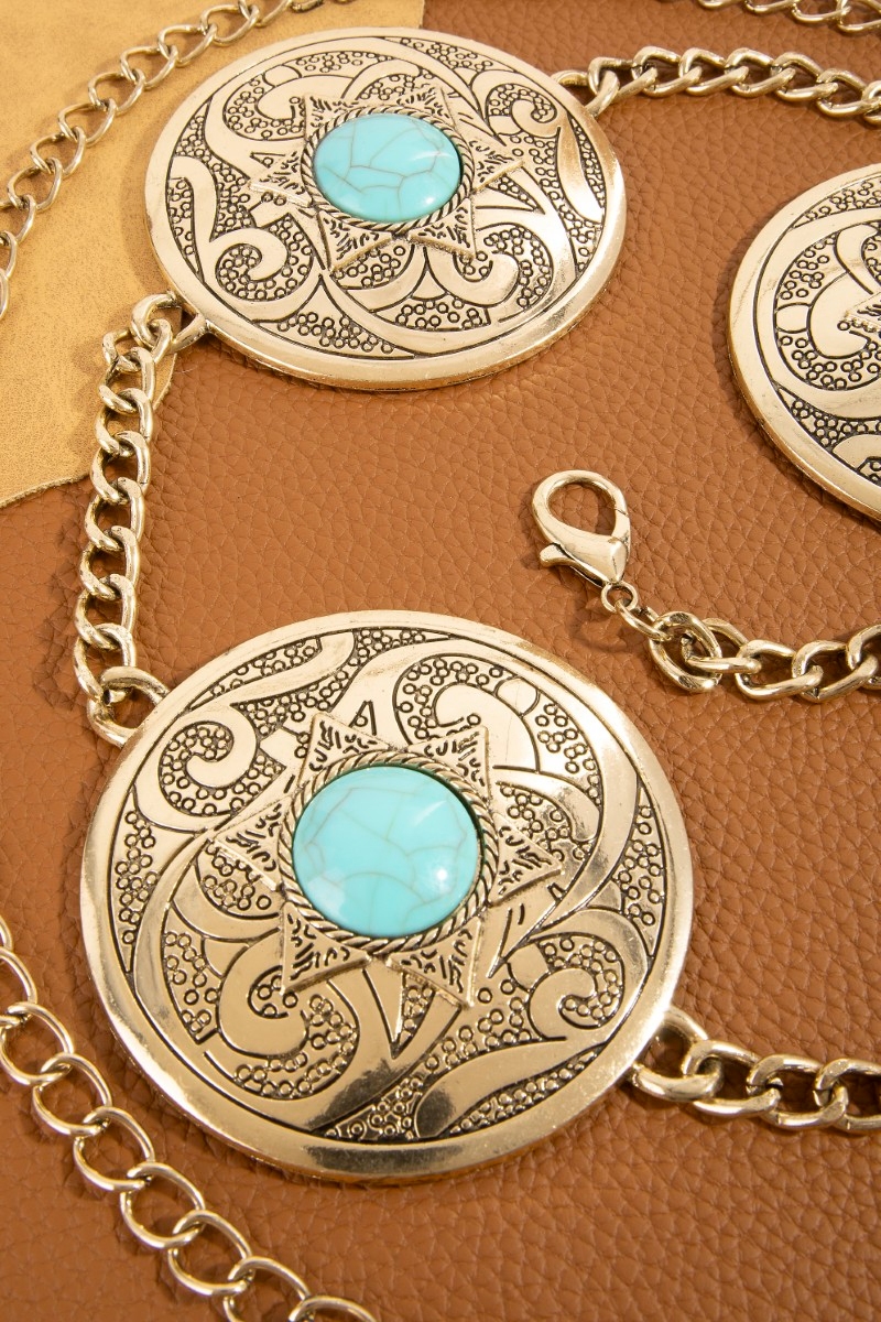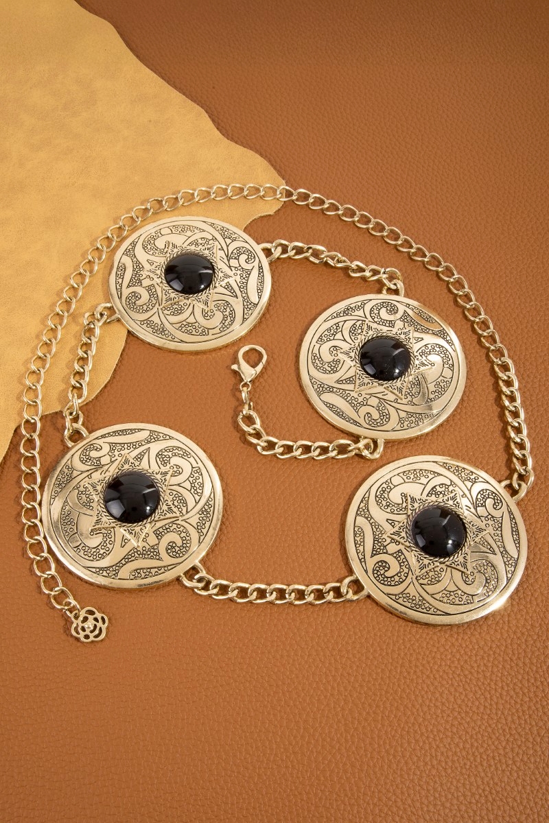 - This chain belt brings a stunning stone stud western engraved disc style. Indulge in the allure of exquisite craftsmanship as this chain belt effortlessly adds a touch of luxury to your attire.