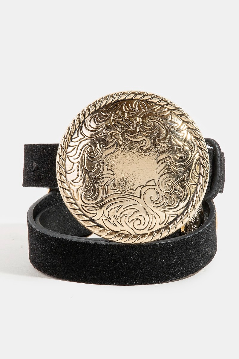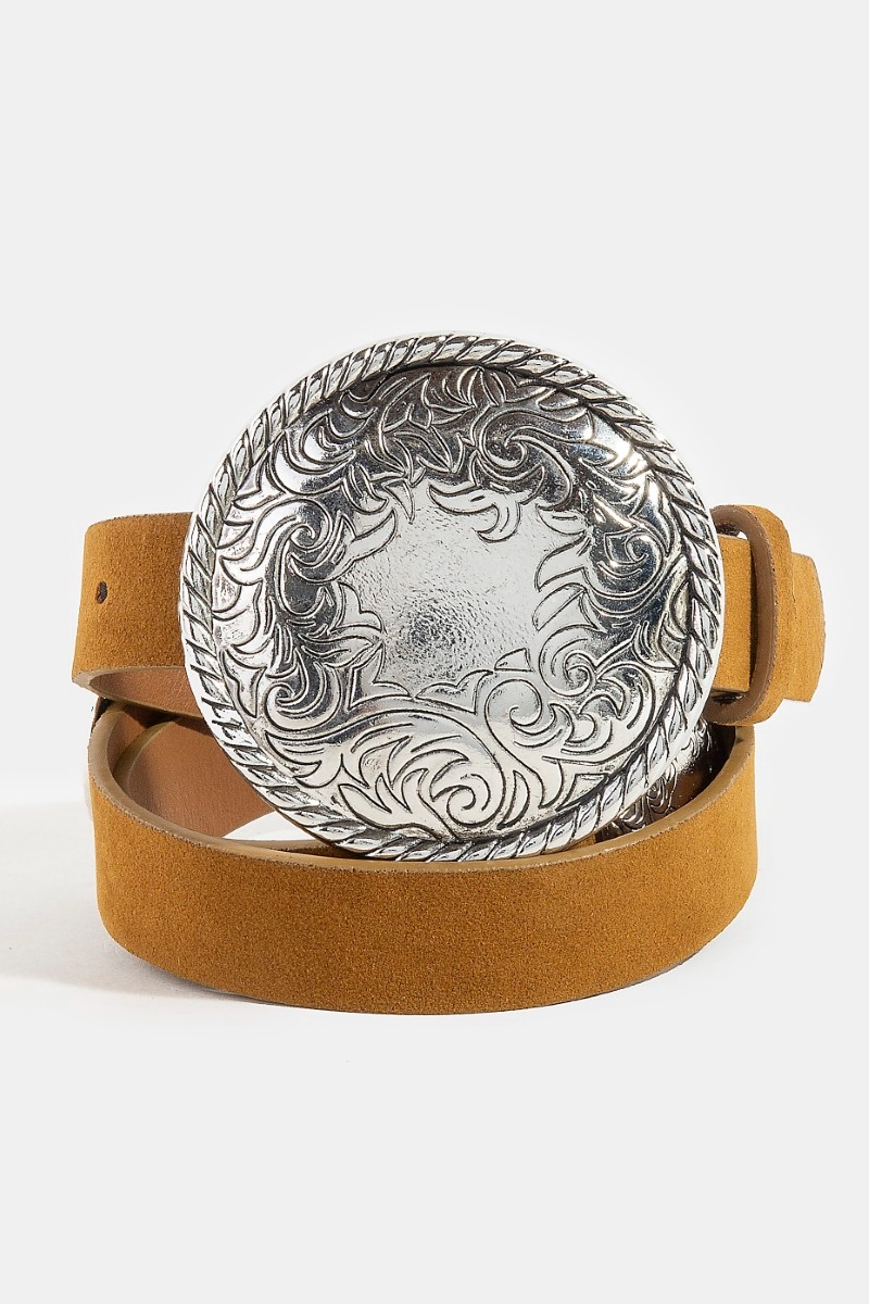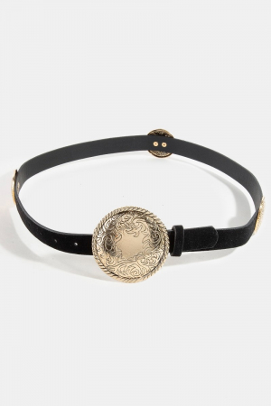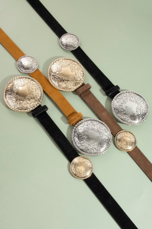 • This leather belt introduces a unique western concho disc buckle vegan style. Experience a burst of creativity in accessorizing as this piece effortlessly sets the tone for your unique style.