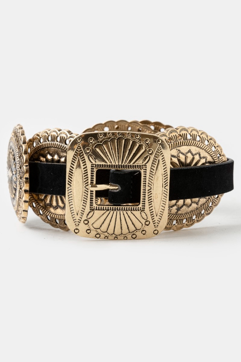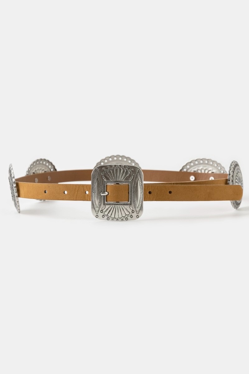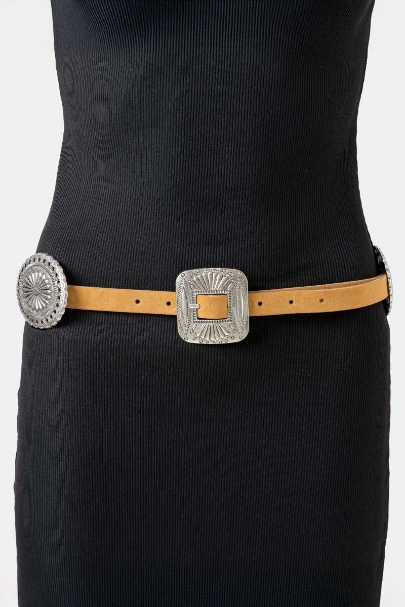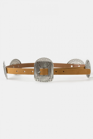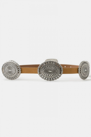 • This belt displays a fashionable western concho disc decor buckle style. Experience a burst of creativity in accessorizing as this piece effortlessly sets the tone for your unique style.