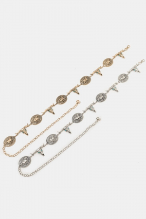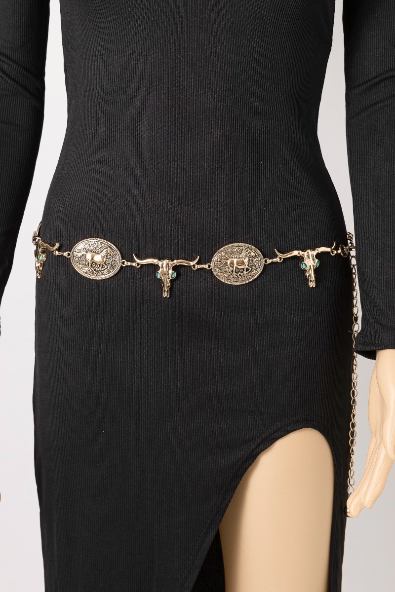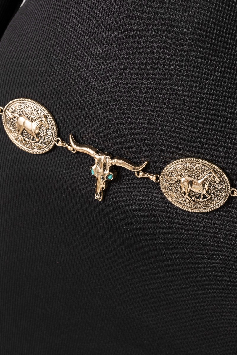 - This chain belt displays a fashionable western horse disc and long horn style. Experience a burst of creativity in accessorizing as this piece effortlessly sets the tone for your unique style.