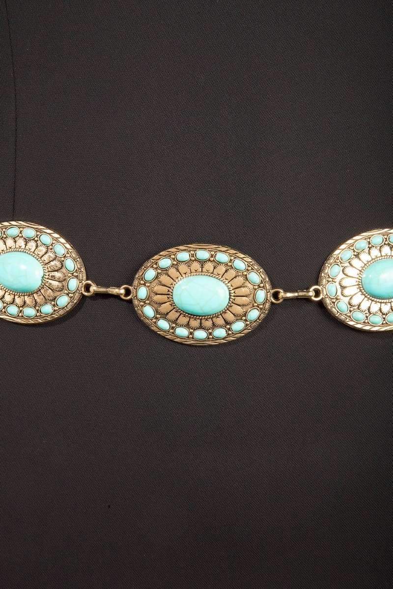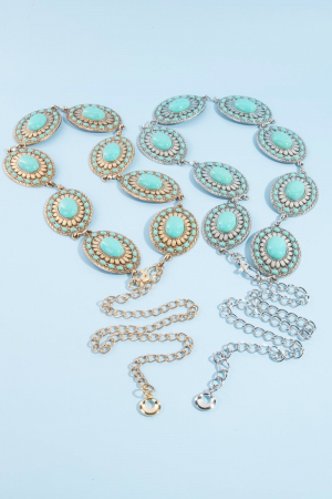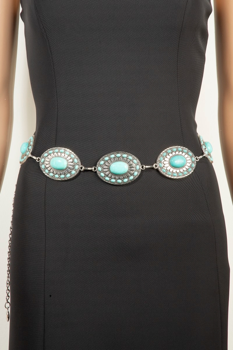 • This chain belt displays a vibrant western mixed turquoise stud oval concho style. Witness the transformative power of accessories as this piece effortlessly redefines your fashion narrative.