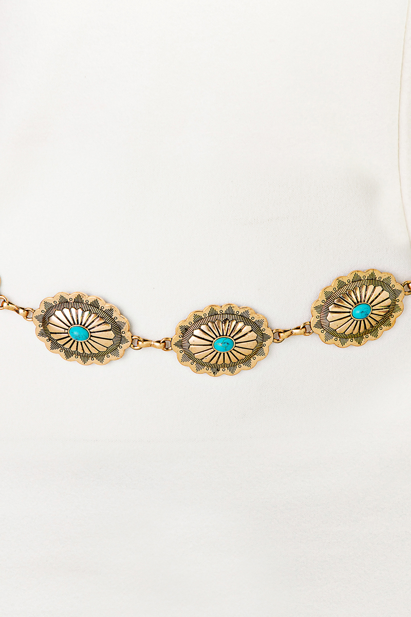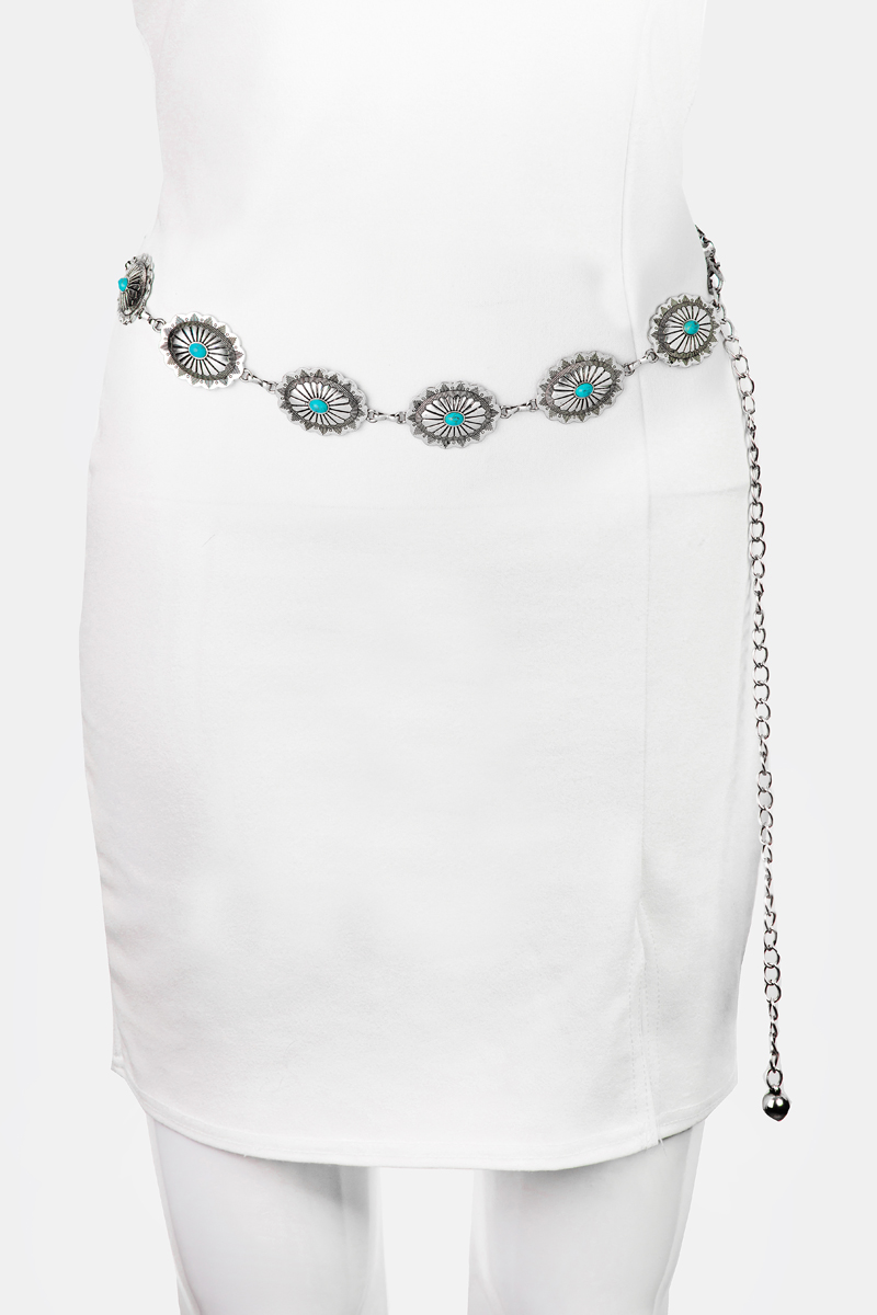 - This chain belt introduces a stunning western oval concho turquoise style. Explore a refined sense of style with this chain belt, seamlessly elevating the chic factor of your look.
